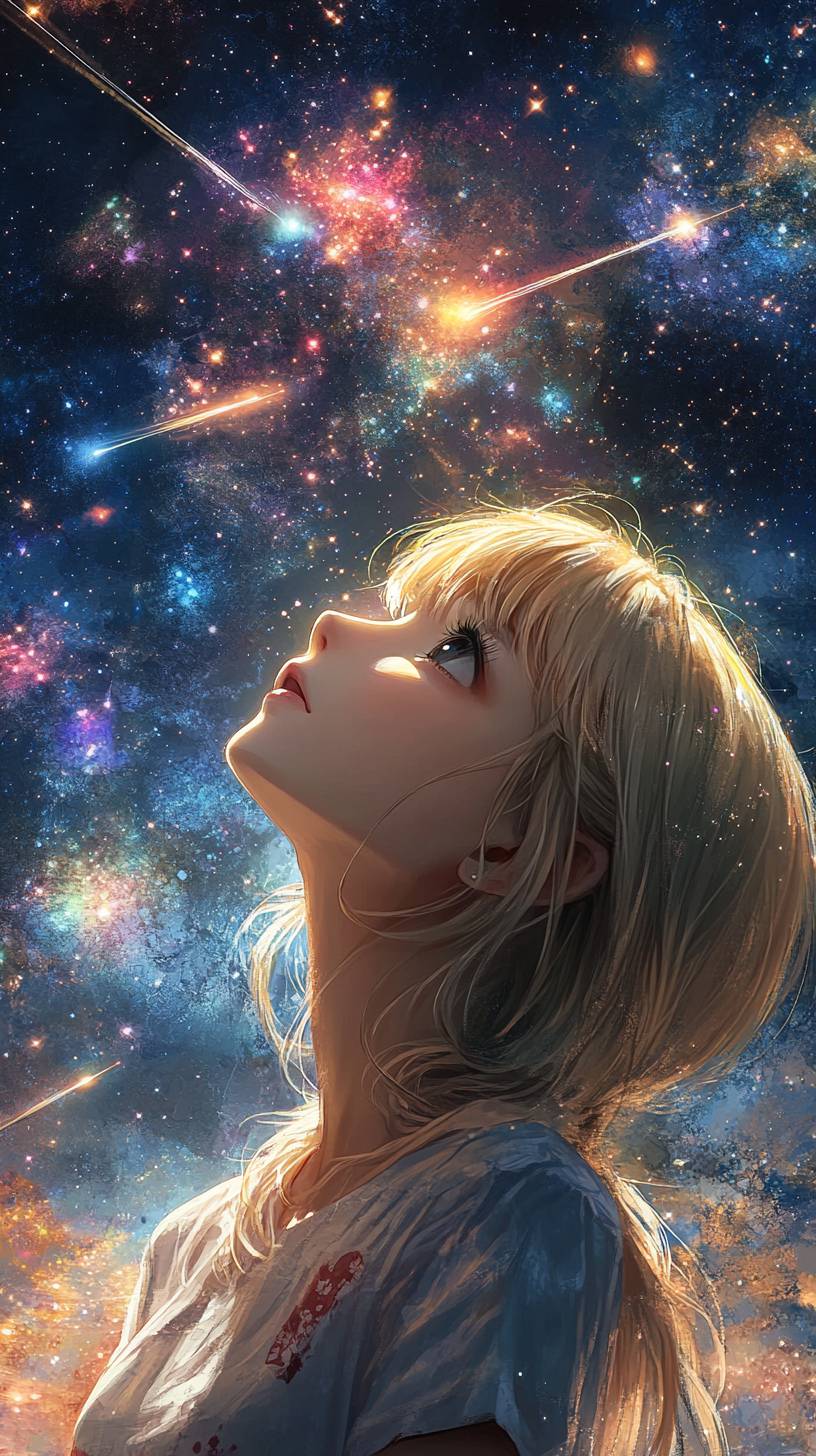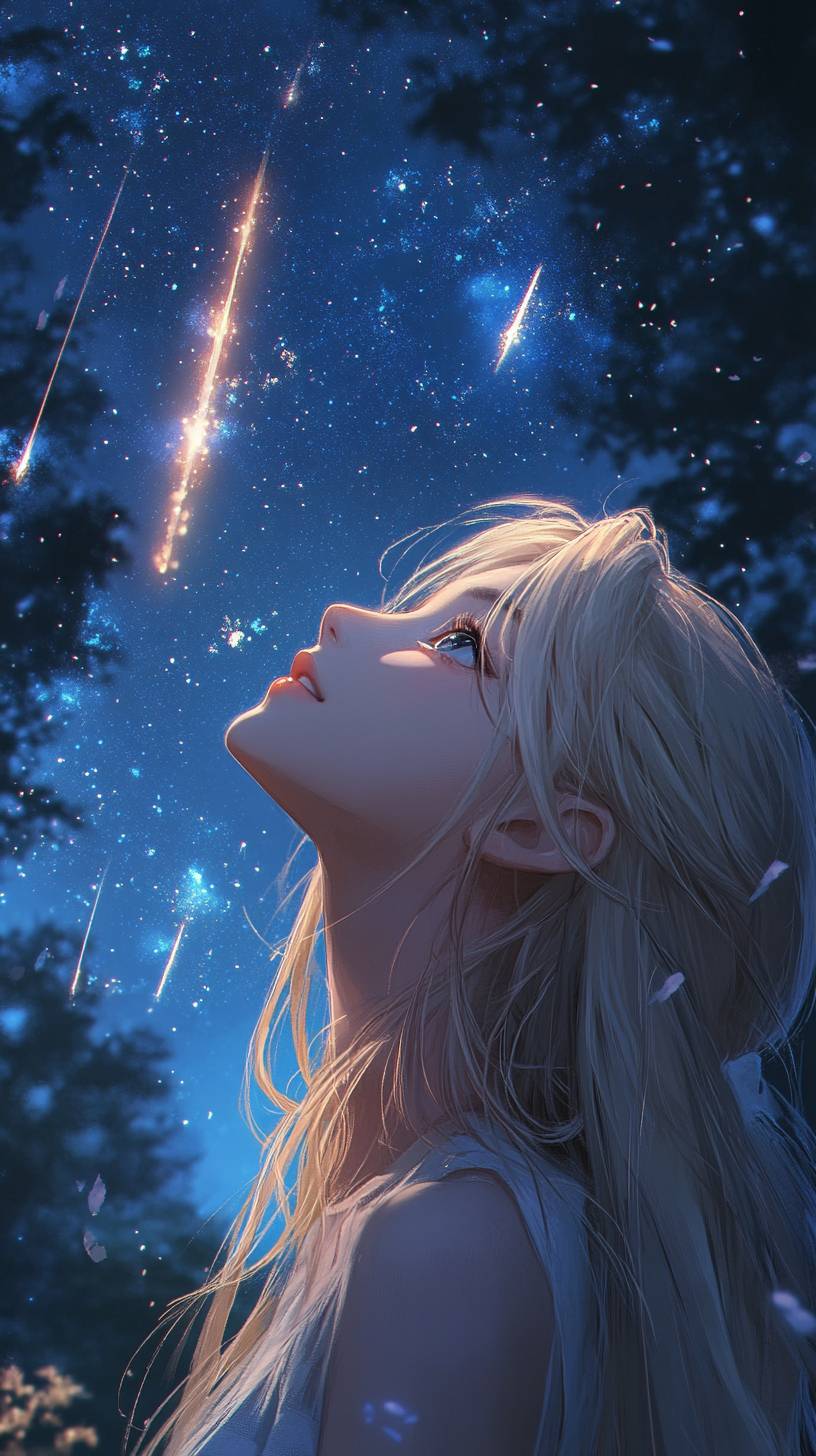 anime phone wallpaper style,A blonde girl in her 20s, with the pure and beautiful appearance of a Korean idol, is looking up at the sky. The night sky is filled with shooting star, depicted in a watercolor style. --ar 9:16 --stylize 300 --v 6.1