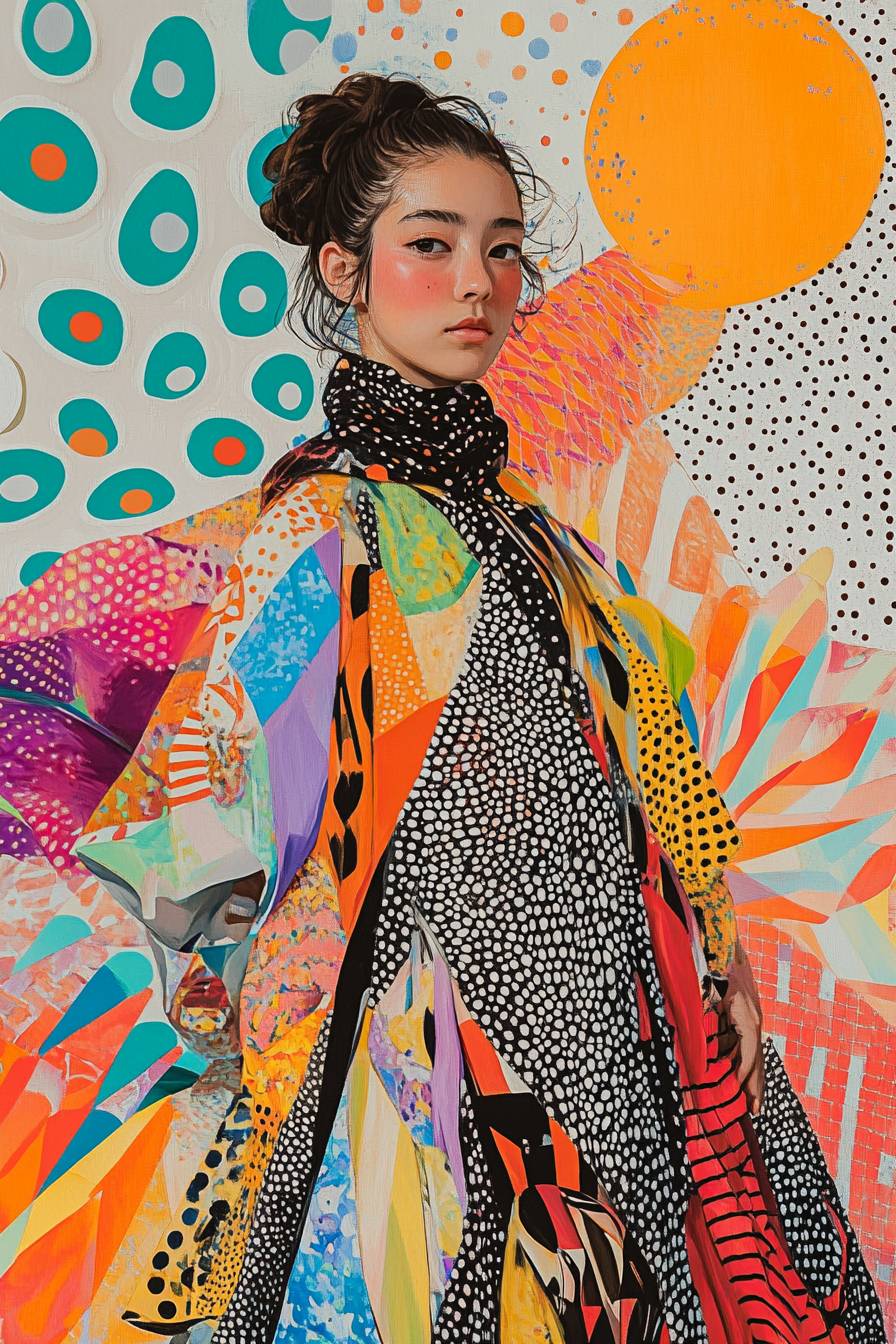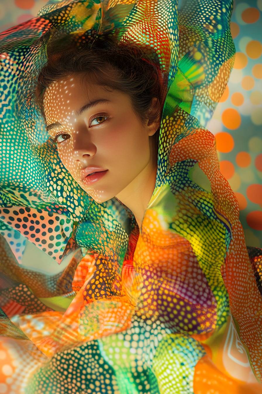 a lively hyperrealistic full body view, kaleidoscopic rendering of a young woman adorned in flowing, semi-transparent fabrics, her features accentuated by bright, geometric patterns intertwined with soft, organic shapes all set against a backdrop of swirling polka dots --v 6.1 --ar 2:3