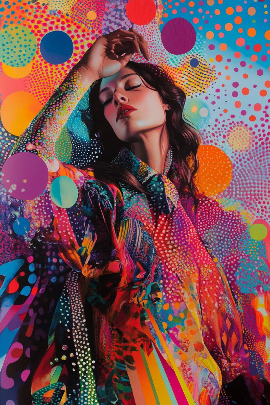 Яркий гиперреалистичный полный облик молодой женщины, украшенной струящимися полупрозрачными тканями, её черты подчеркиваются яркими геометрическими узорами, переплетенными с мягкими органическими формами на фоне закрученных горошков.