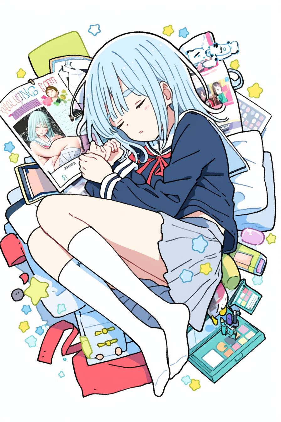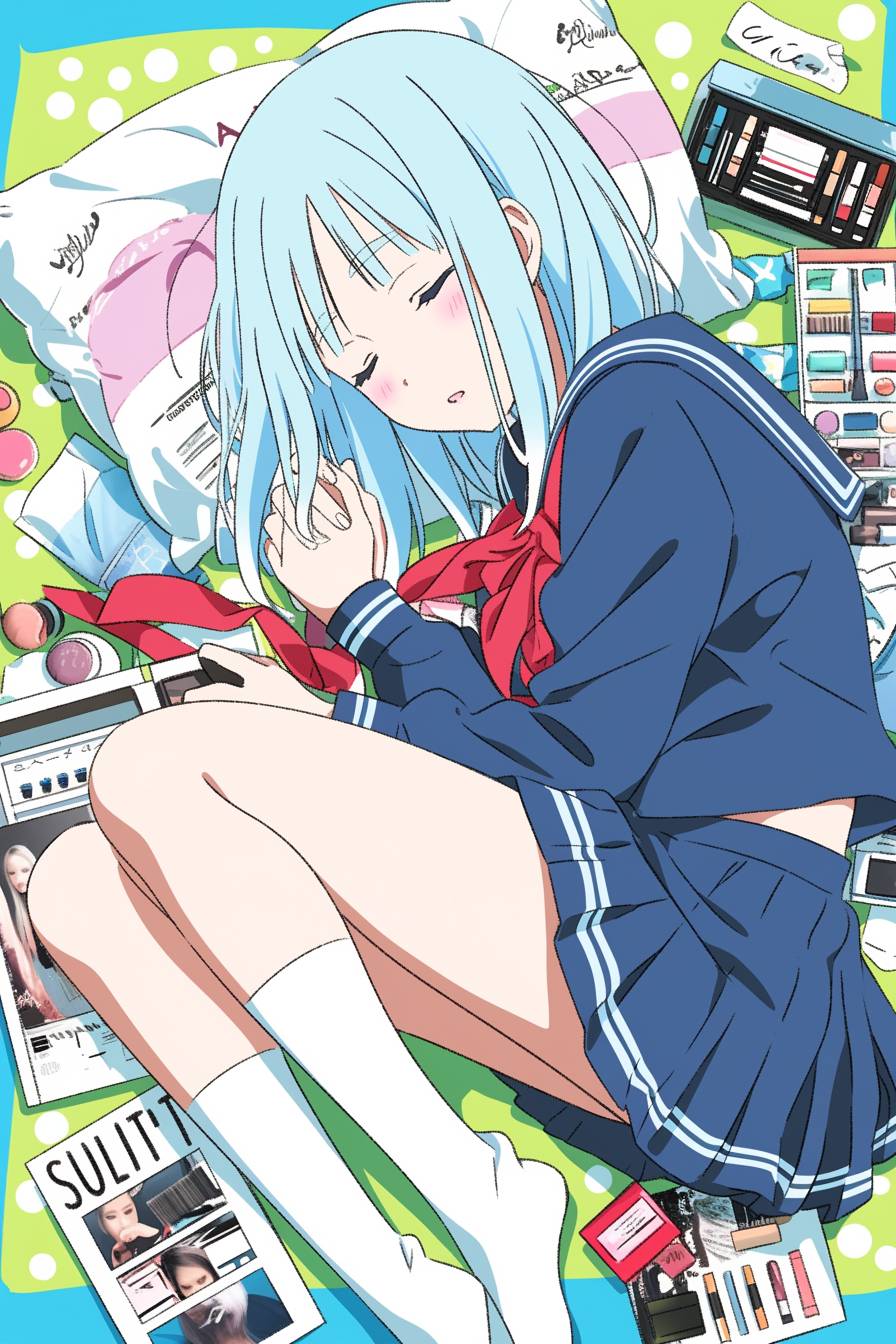 Создает полноразмерную иллюстрацию девушки в аниме-стиле, спящей на кровати. Главный персонаж - милая школьница с светло-голубыми волосами средней длины. У нее тонкие брови и бледно-розовые губы. Она носит темно-синий школьный форменный костюм и красный галстук на шее, а также белые носки. На ее животе лежит модный журнал. В комнате есть комод и косметика. Ключевое визуальное изображение аниме. Супер широкий ракурс. Полноразмерный кадр.