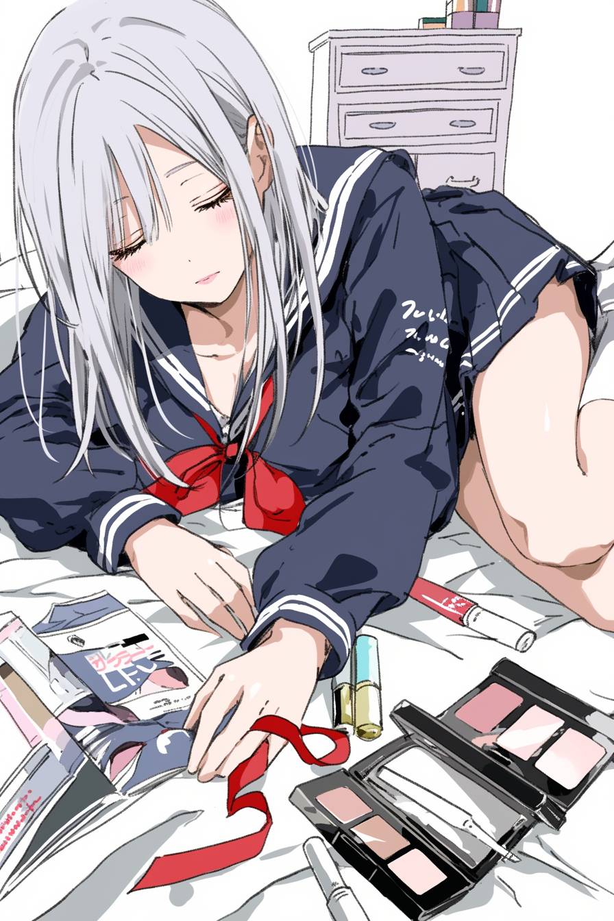 Generates a full-body illustration of an anime-style girl sleeping on a bed. The main character is a cute high school girl. Her hair color is light blue. Her hairstyle is a medium hair. Her eyebrows are thin . Her lips are pale pink . She is wearing a navy blue sailor uniform. A red ribbon is tied around her neck. She is wearing white socks. There's a fashion magazine on her stomach. There is a dresser and cosmetics in the room. Anime key visual. Super wide shot . Full body shot. --no minimum quality, minimum detail, poor illustration --chaos 5 --ar 2:3 --style raw --personalize 64uzleg --stylize 1000 --niji 6