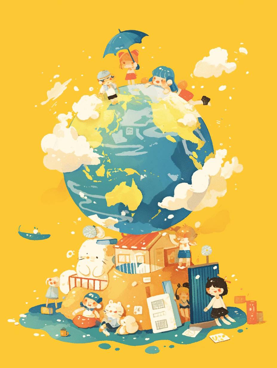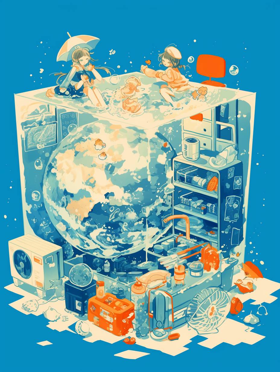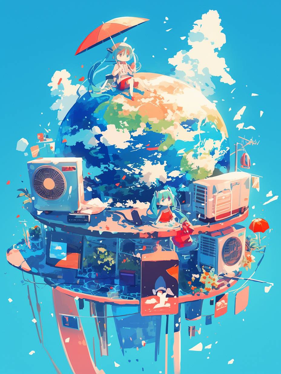 The earth is too hot and then melt, the head of the earth has a small person wearing different clothes to play happily together, wearing a T-shirt, wearing a skirt, wearing a down jacket, playing an umbrella, and wearing a hat, there are a lot of refrigeration appliances below the earth, air conditioning fans and so on --ar 3:4 --niji 6