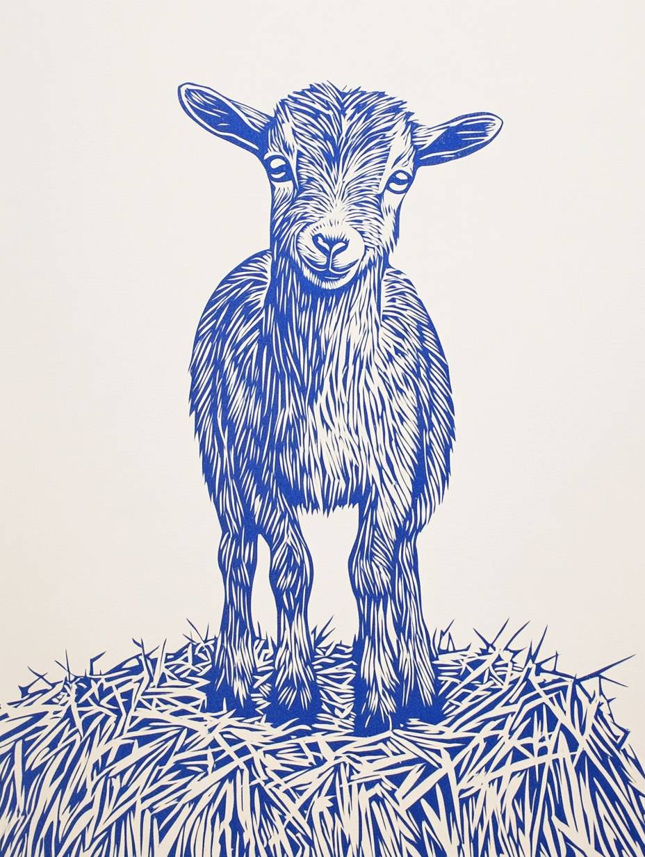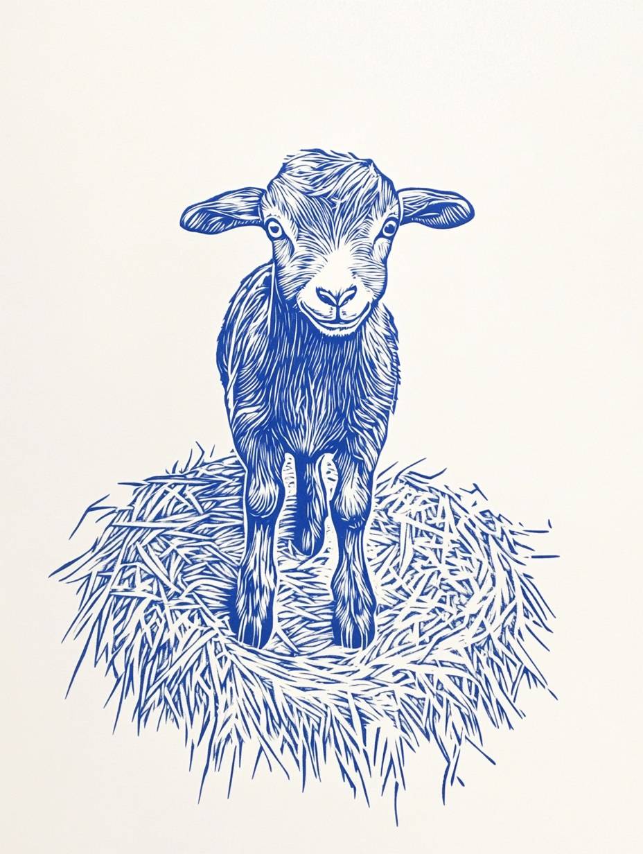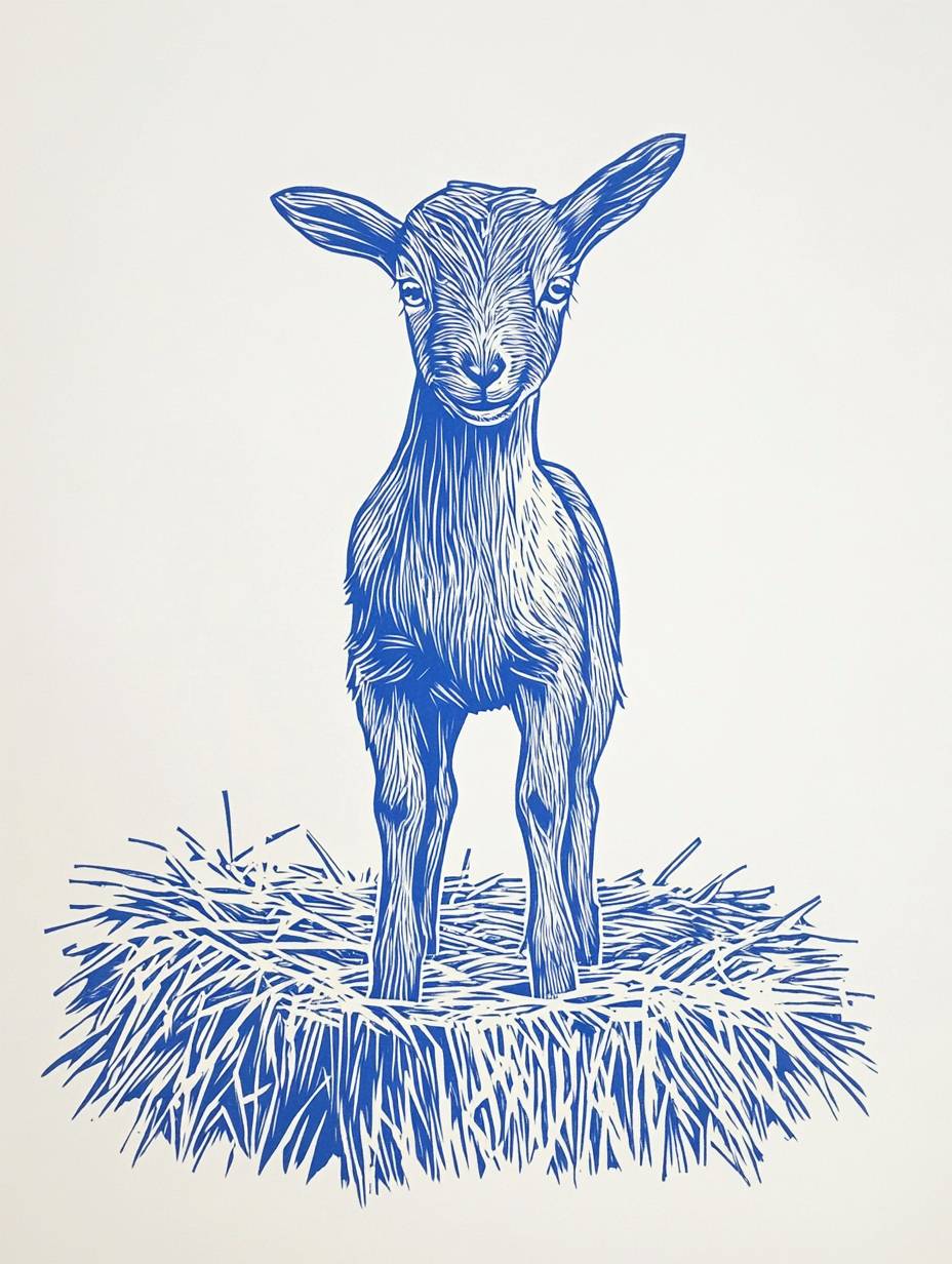 A linocut print of a baby goat standing on a round straw bale looking at the camera. In blue against an isolated white background. The design is simple and elegant, focusing solely on her form. The camera is at eye height, but zoomed out so you can see the whole straw bale --ar 3:4 --stylize 50 --v 6.1