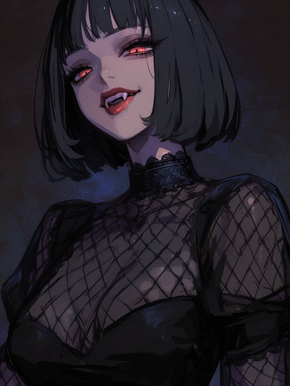 Вампирша с черными волосами в стиле боб и готической одеждой, улыбается с видимыми клыками.