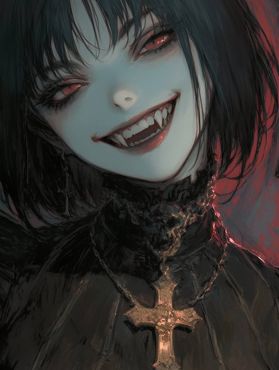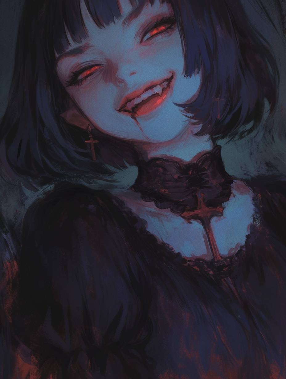 Женщина-вампир с черными каре и красными глазами, одетая в готическом стиле, напоминающем иллюстрации манги Дзюньдзи Ито. Она улыбается, показывая клыки на шее. Темный фон.