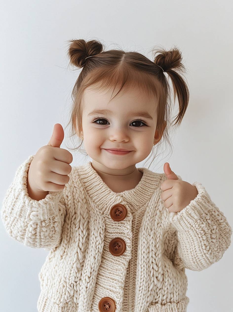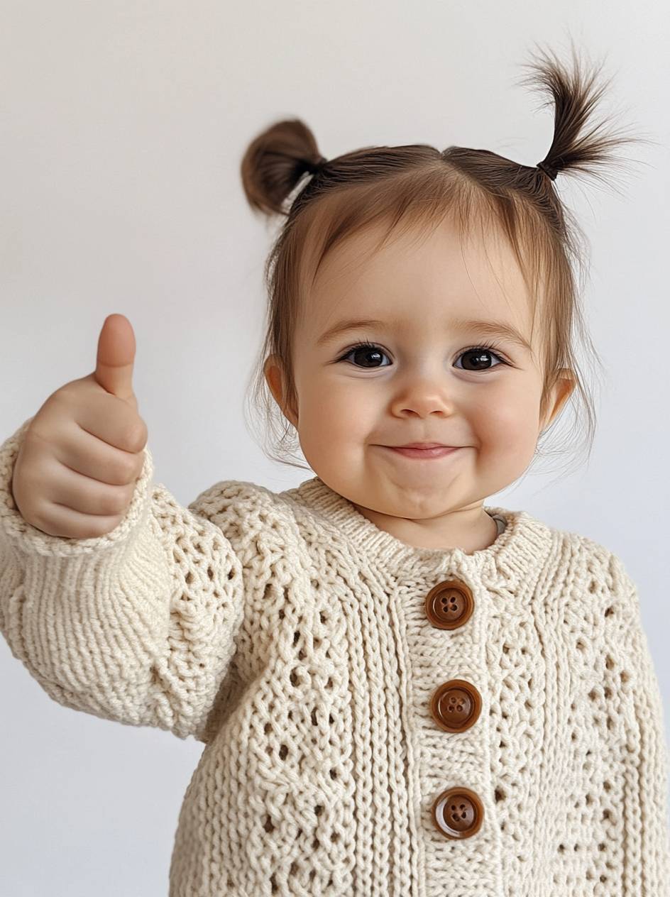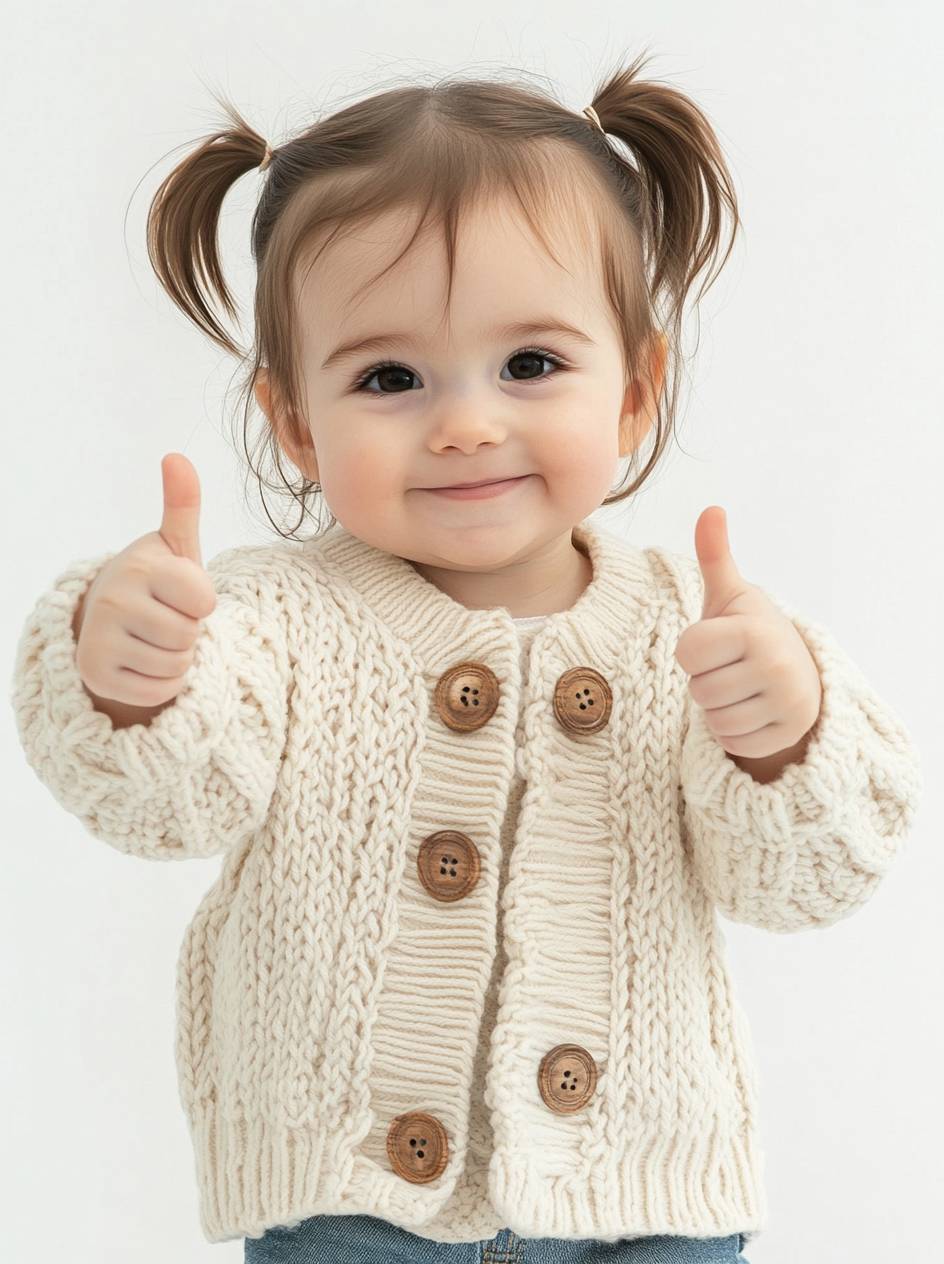 A cute baby girl wearing an open-knit cardigan with buttons, giving the thumbs up sign and smiling at the camera. The background is white. She has brown hair in pigtails. The sweater's coloration resembles cream or beige. --ar 29:39 --style raw --v 6.1