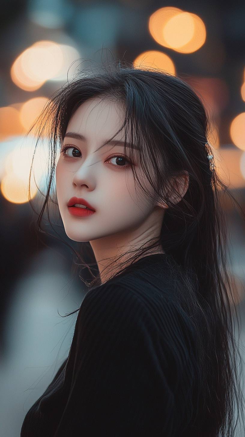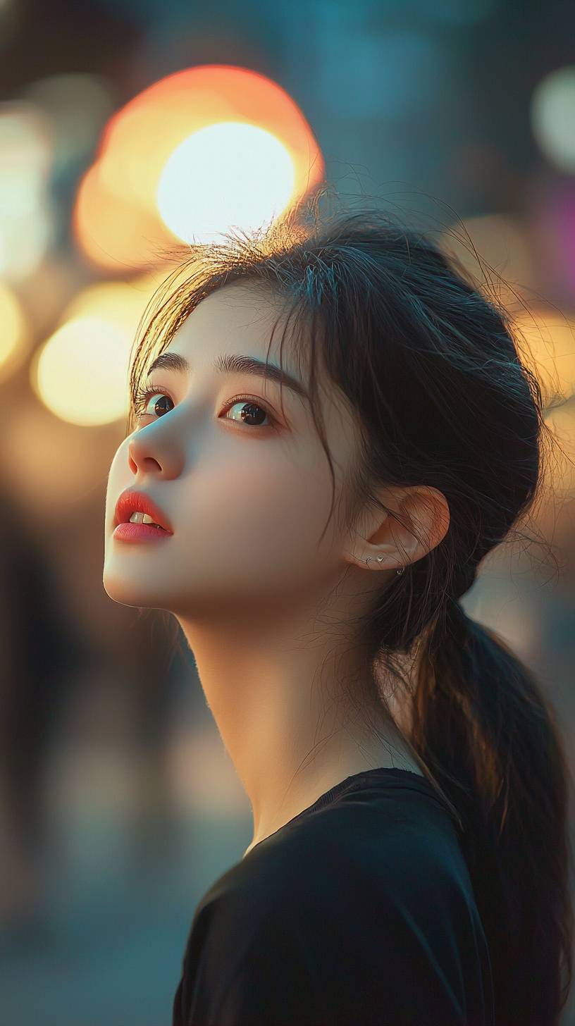 Молодая китайская позитивная красота, нежная улыбка, круглое и полное лицо, деликатная и гладкая кожа, сложный и драматический городской фон, мягкое освещение, киношный стиль, фотографическая работа, демонстрирующая грациозный и необыкновенный темперамент.