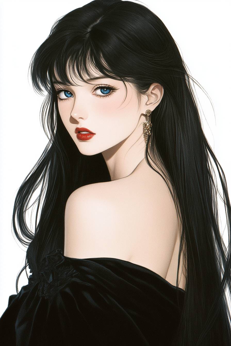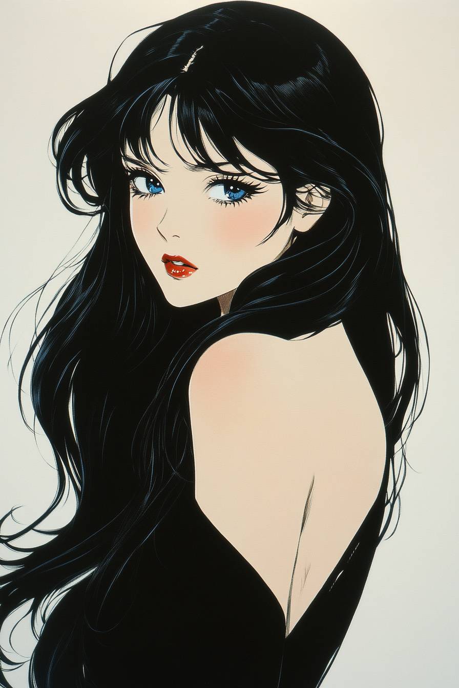An 80s anime-style portrait of a beautiful woman with long black hair and blue eyes, wearing an elegant dress and red lipstick, looking over her shoulder against a white background, in the style of Yoshiaki Kawajiri, Tsukasa Hojo, and Toshihiro's Japanese art style. --ar 85:128 --v 6.1