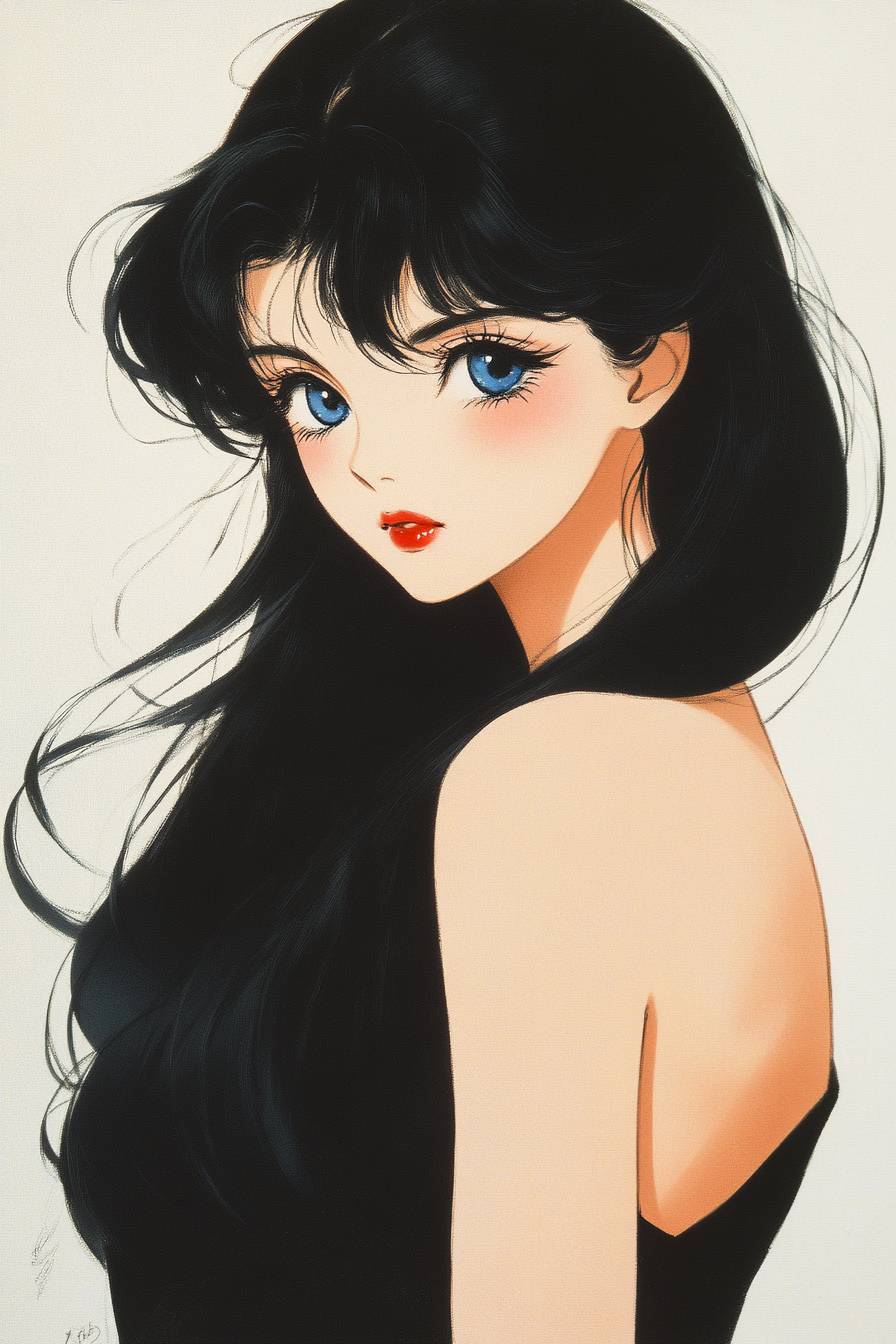 Портрет красивой женщины в стиле аниме 80-х годов с длинными черными волосами и голубыми глазами, в элегантном платье и красной помаде, смотрящей через плечо на белом фоне, в стиле японского искусства Ёсиаки Каваджири, Цукасы Ходзё и Тошихиро.