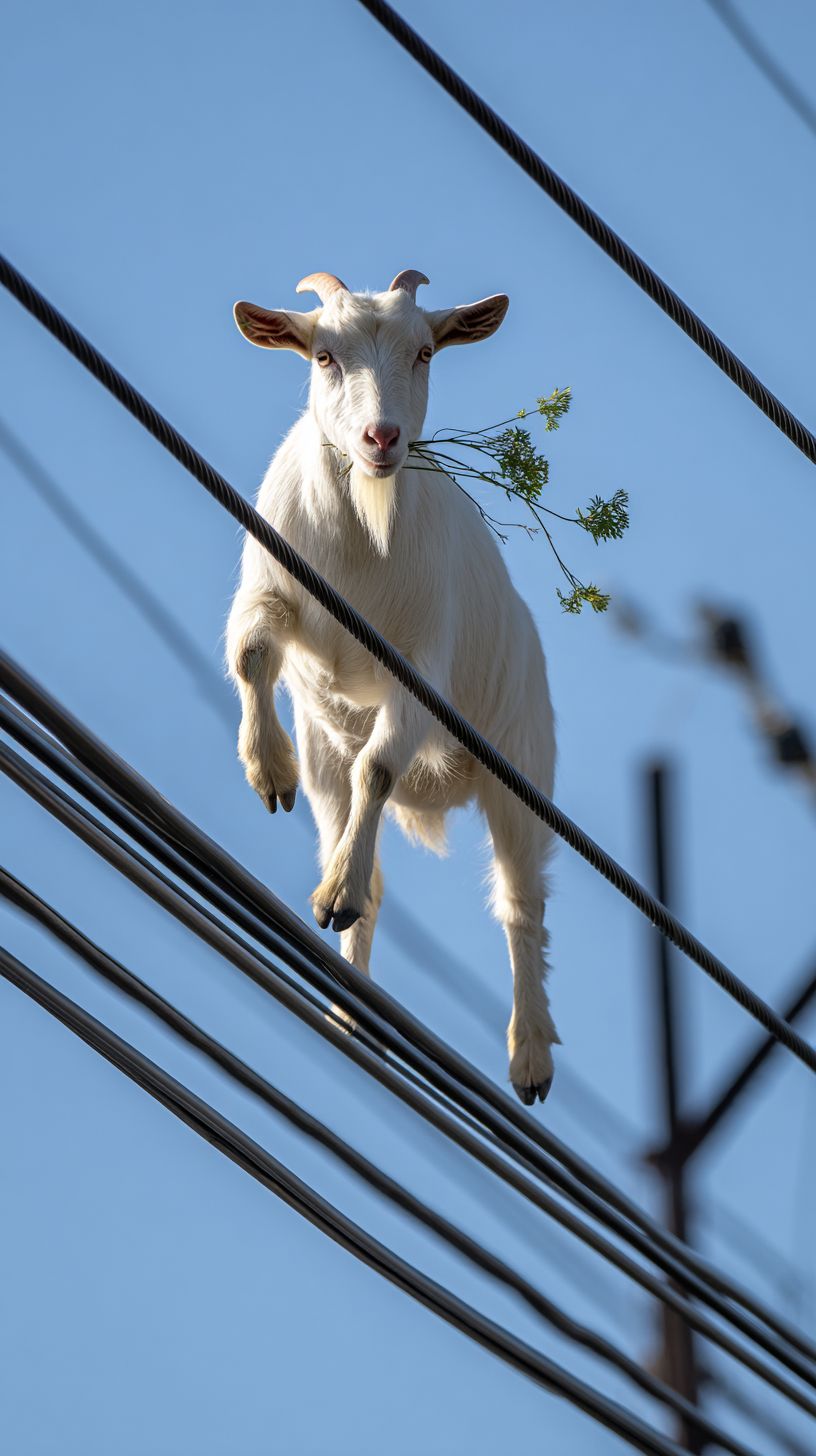 Это фотография, запечатлевшая удивительный момент, когда белая коза идет по электрическому проводу. Коза расположена немного слева от центра, она в процессе шага, передние ноги подняты, а задние выпрямлены. Ее шерсть чисто белого цвета, видны маленькие рога. Коза держит в пасти небольшую зеленую ветку, что добавляет игривый штрих к сцене. На заднем фоне ясное голубое небо, что указывает на дневное время. Электрические провода, которые черные и многочисленные, переплетаются в изображении, создавая паутиноподобный узор. Провода поддерживаются металлическими опорами, одна из которых видна в нижней части изображения. Фотография сделана с низкого ракурса, что подчеркивает смелый поступок козы и высоту проводов.