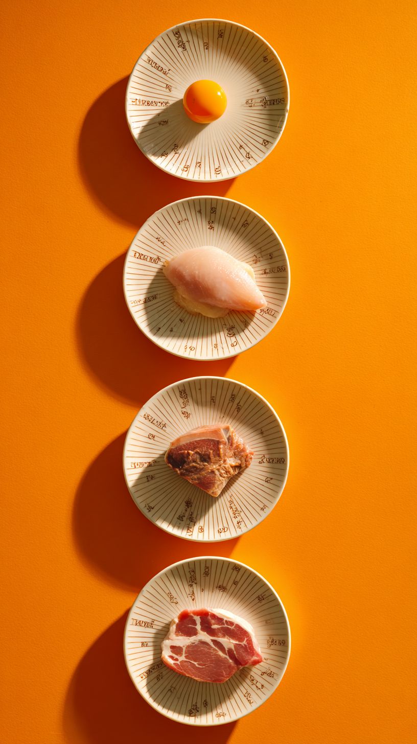 On a vivid orange background (#fa7d00), four independent white ceramic plates are aligned vertically in a straight column, evenly spaced. Each plate features a unique ingredient: top: a single egg, second: a raw chicken fillet, third: a raw duck breast with natural fat texture, bottom: a raw pork loin with visible marbling. All ingredients are in natural color, realistic texture, with no repetition. Controlled artificial studio lighting from the upper right creates consistent base shadows beneath all plates, however, each ingredient casts its own distinct moving shadow on the plate, with each product’s inner shadow rotating quickly like a clock hand, representing its own peak time. Thin engraved radial lines are visible on each plate rim, with subtle accent lines in brand green (#002800). The tone is scientific yet poetic, embodying editorial minimalism with a cinematic rhythm of light, dynamic yet balanced composition, Be Odd, Eat Real ODD GROCER.