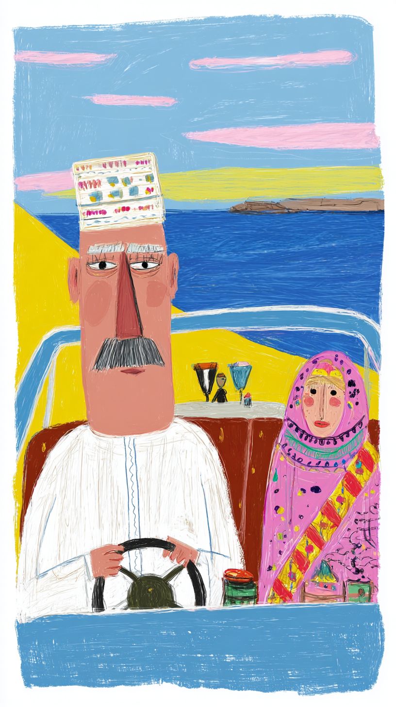 A richly detailed close-up illustration in naive hand-painted style, baroque and humorous atmosphere. A clearly masculine elderly Maghrebi man, the Hajj, with a mustache and dignified face, drives a luxurious convertible car by the seaside at sunset. He wears a traditional white outfit with a fez. Beside him, a clearly feminine elderly Maghrebi woman, the Hajja, sits proudly, wearing a colorful veil and traditional dress with ornaments, her expression playful and joyful. The scene is funny and iconic, with saturated colors, naive texture, whimsical details, ocean and golden sunset in the background.