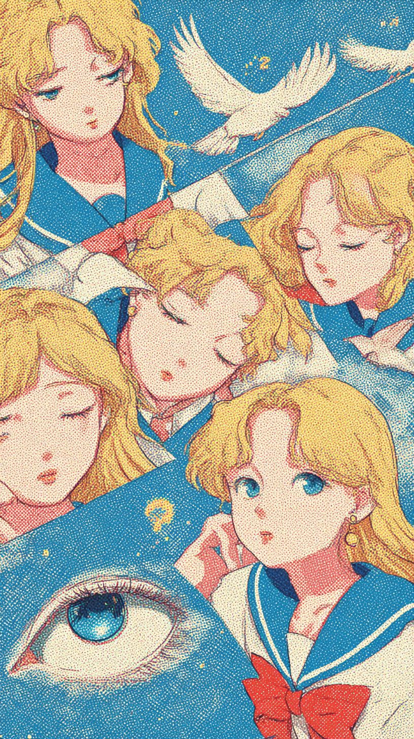 Digital illustration, manga sticker collage style, textured blue background with dot and grid patterns, central blonde girl in a sailor school uniform with red painterly halo and angel wings, repeated in overlapping comic panels, multiple cute expressions (sleeping, calm, thoughtful), surrounded by flying white doves, pixel art question mark, yellow outline star, close-up eye with sky clouds reflections, playful cutout arrangement, generous negative space, not crowded. Clean textured lineart, pastel colors, soft grain, matte powdery surfaces, no harsh shine, soft-colored outlines with faint white borders, gentle dot tones for shading. Color palette: gentle blues, creams, soft yellow, powder pink, red accents. Vintage manga screentone, VSCO pastel filter, low contrast, matte look, faded shadows, analog grain. Dreamy, gentle, nostalgic, cartoonish, neo-retro shoujo pop art, soft airbrush effect, Instagram editorial mood.