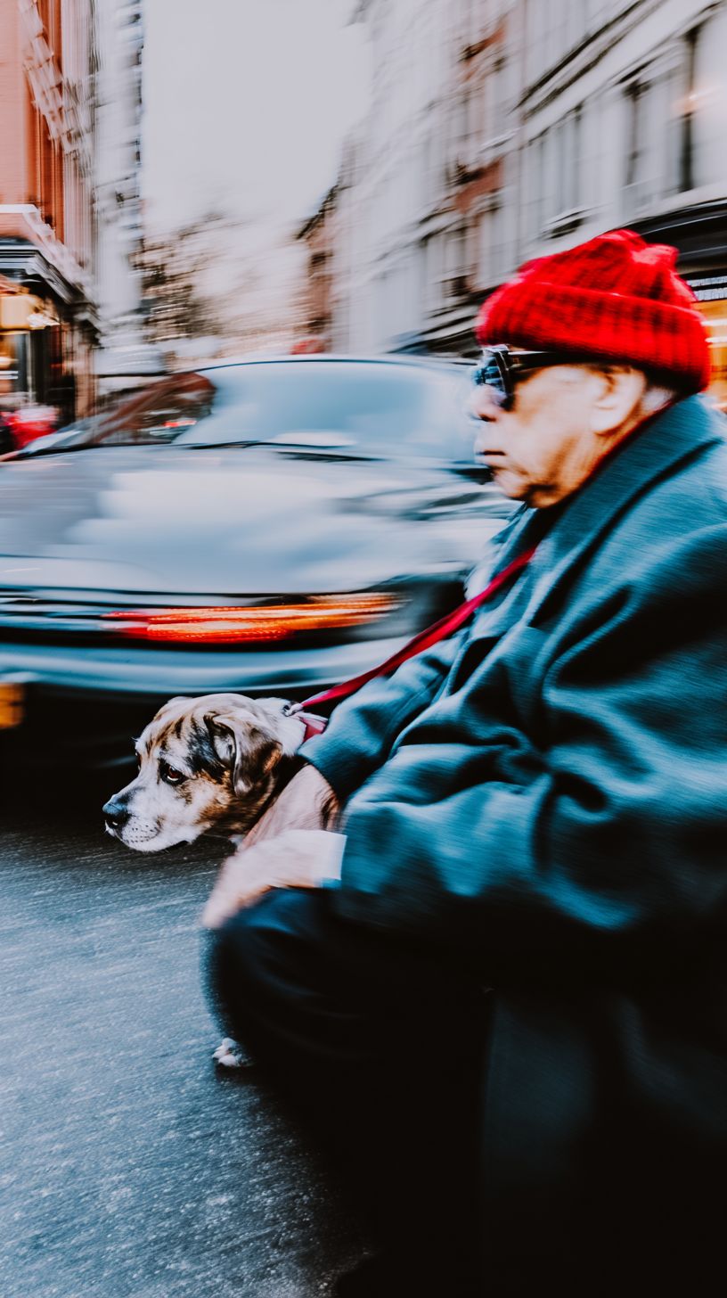 Candid street photography, documentary realism, New York City sidewalk (SoHo vibe), vintage elderly man in a red knit beanie, worn wool coat, stylish vintage sunglasses (70s/80s frames, lightly tinted), serious mysterious expression, looking away from camera, unposed moment, he gently pets a dog with a matching red leash; a car passes in the near foreground with strong motion blur, inside the car another dog looks out the half-open window at them, layered street story natural winter daylight, wet asphalt sparkle, storefront reflections, shallow depth of field, crisp focus on the man + dog, foreground smear from the passing car, soft background bokeh; lens flares + light leaks, halation on highlights, subtle vignette, fine film grain, slight chromatic aberration, handheld feel full-frame street camera look, 35mm prime (alt 50mm), f/1.8, 1/500s, ISO 400-800