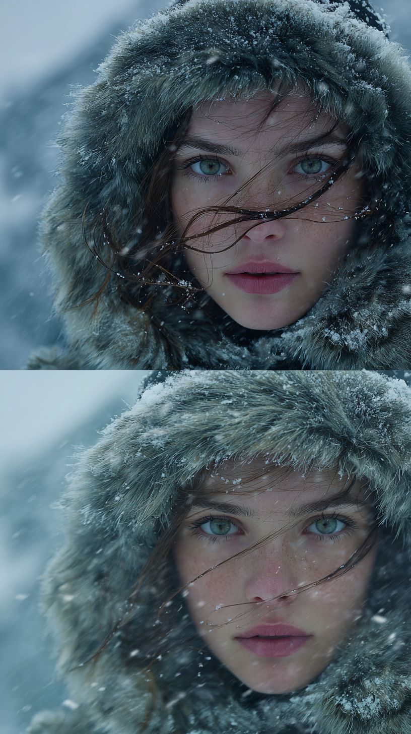 A photorealistic cinematic still from a fashion shoot, an expensive street shoot in the snowy mountains during a severe snowstorm. A young Ukrainian woman with facial features similar to the second image (same bone structure, eye shape, cheekbones, lips, eyebrows), without sunglasses, a hood, or additional accessories. She is wearing a heavy fur coat, as in the first image, with loose strands of hair blowing in the wind across her face, snowflakes clinging to her hair and fur. Her cold breath is noticeable, her skin has a natural texture with pores and barely noticeable freckles, and her cheeks are slightly flushed from the cold. The pose and camera angle match the first image: a medium close-up, a straight-on shot at eye level, a full frame, an intense, calm gaze slightly beyond the lens, and no smile. Setting: A desaturated snowy landscape with craggy mountain shapes blurred in the background, heavy snowfall and wind-blown snow streaks, shallow depth of field. Shot with a Hasselblad H6D-100c, 120mm f/4 macro lens, ISO 100, f/4, 1/200 sec, super-sharp focus on the center of the eyes, shallow depth of field with softly out-of-focus edges. Lighting: A large, diffused softbox positioned at a 45° angle from above for a smooth, even key light without harsh shadows; a subtle rim light from behind to outline the head and enhance the texture of the fur; a silvery-white reflector from below, front, to brighten shadows under the nose and chin; clean, controlled highlights on the skin and hair, crisp microcontrast only in the plane of focus. Color Grading: Warm editorial tone, clean skin tones with preserved pores, minimal contrast, slight purple shift in fur tones, subtle golden reflections in highlights, soft cinematic softness plus a fine, high-quality micro-grain.