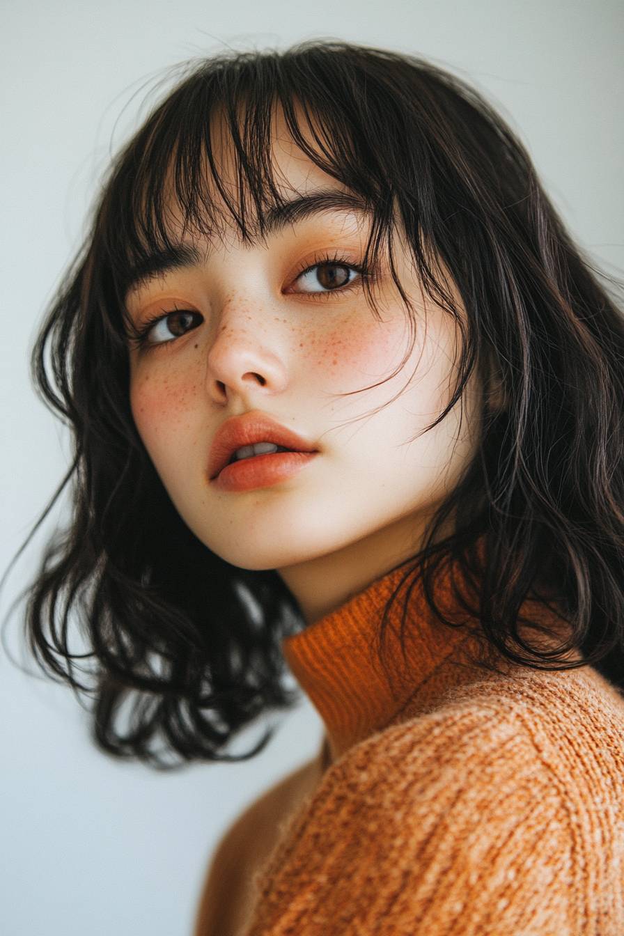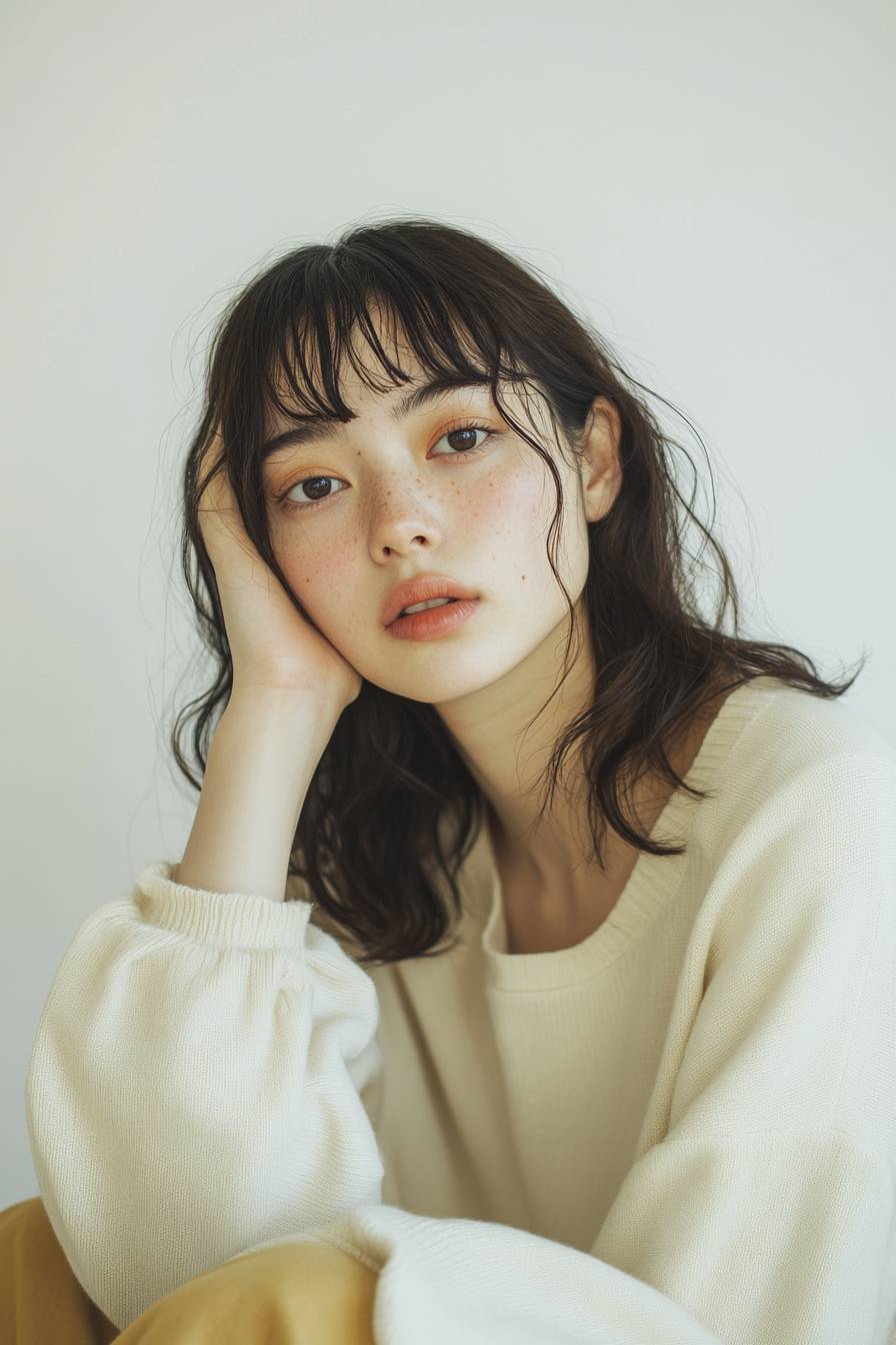 亚洲女性时尚杂志的拍摄,模特有短刘海,长发为羊毛卷,发色为米棕色,穿着休闲衣服和裤子。这位亚洲女性正在为镜头摆姿势,脸上没有化妆,脸上有雀斑,肤色很细腻。这些照片是用徕卡相机拍摄的,全彩色,光线来自室内的自然白光。