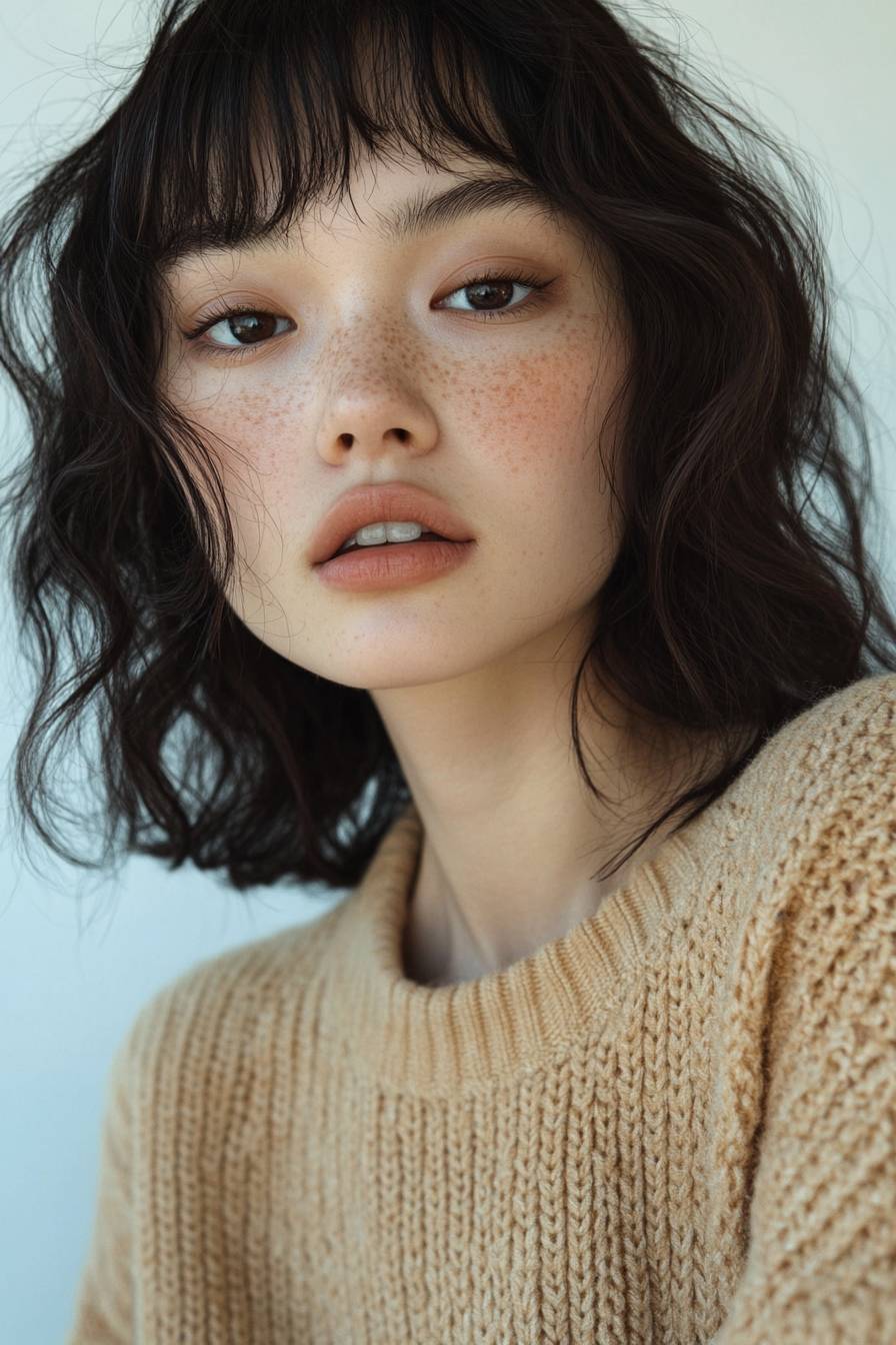 Asian women's fashion magazine photo shoot. She has short bangs in a dog-nose style, long hair in wool curls, her hair color is beige brown, and she wears casual clothes and pants. The Asian woman is posing for the camera. She had no makeup on her face and had freckles on her face. Her complexion is very delicate. The photos were taken with a Leica camera and are in full color. Image, white indoor sunlight --ar 2:3 --v 6.1