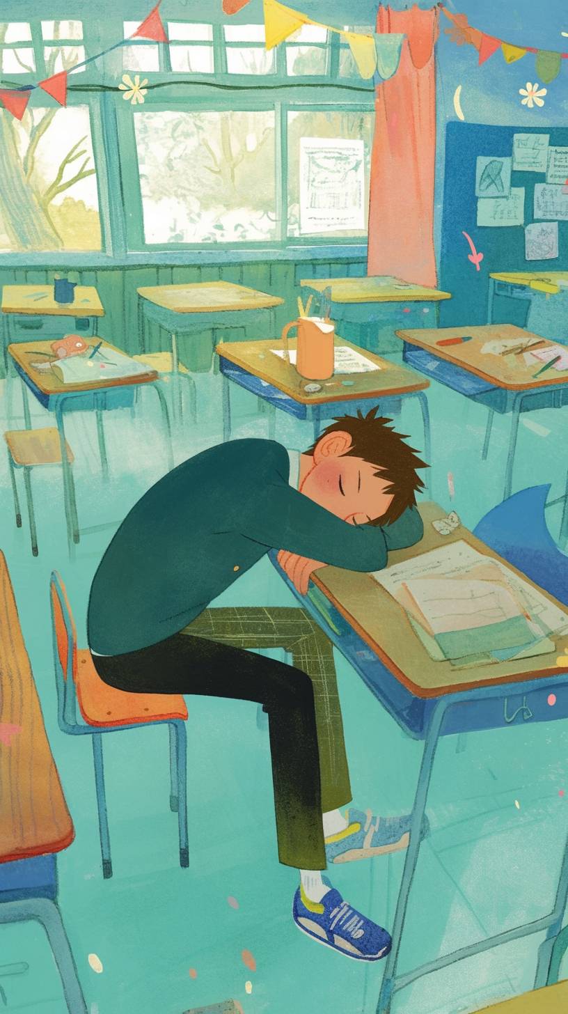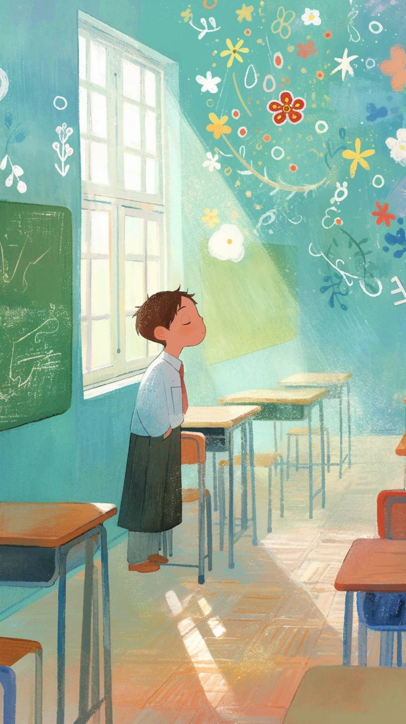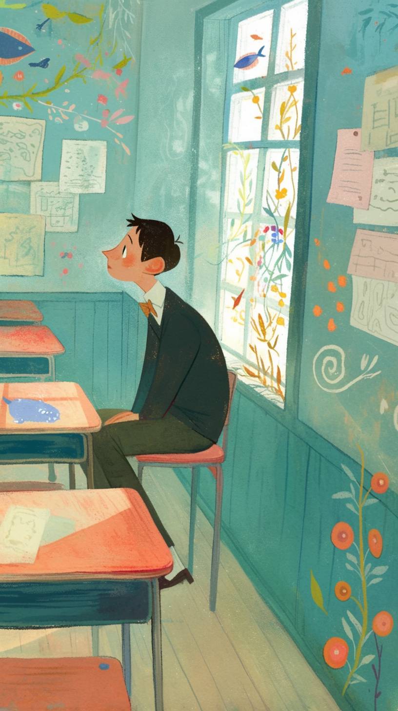 illustration of a a solitary boy in a deserted Japanese high-school class --ar 9:16 --niji 6 --sref 3387532994