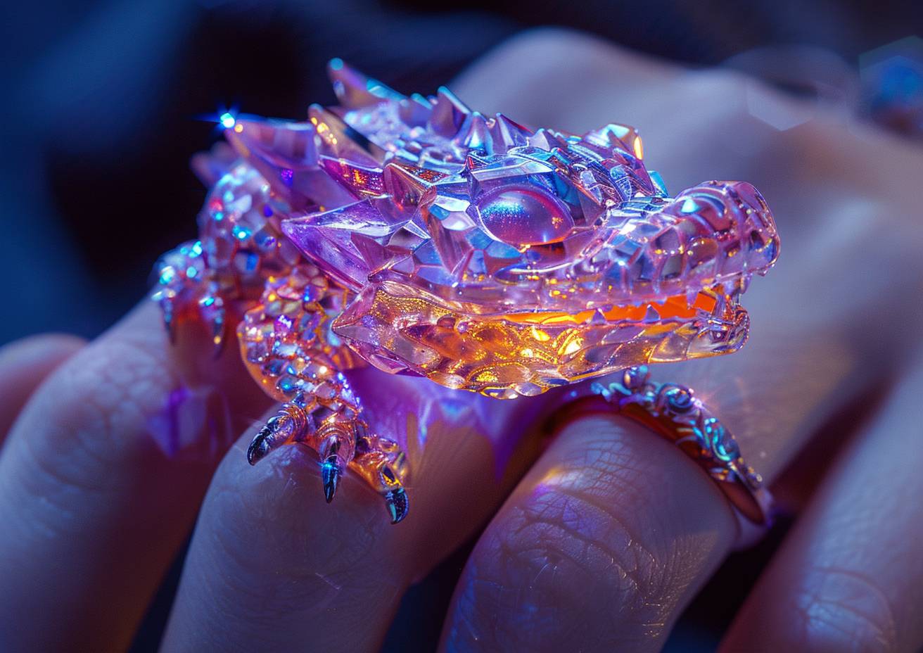 close-up, a miniature crystal dragon, mounted on a woman's ring, in the style of isomalt crystals, tenebrism, glowing radiant colours --ar 7:5 --stylize 250 --v 6.0