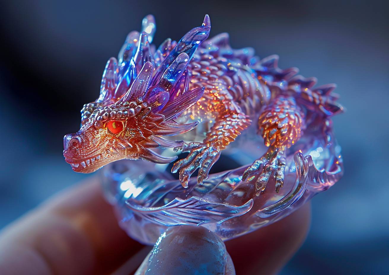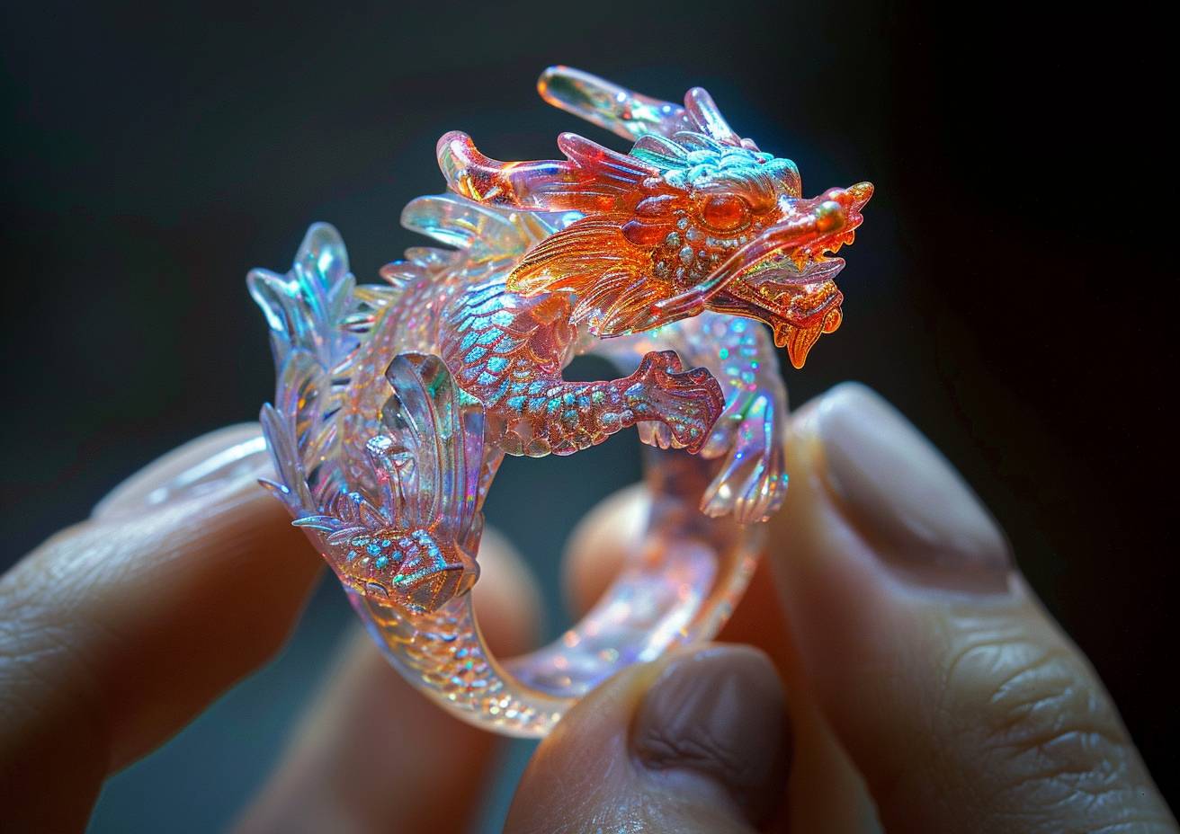 戒指上的微型水晶龙,呈现光辉的色彩,采用光影对比的风格。