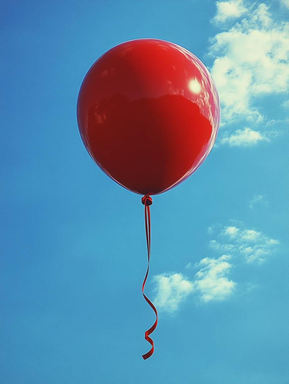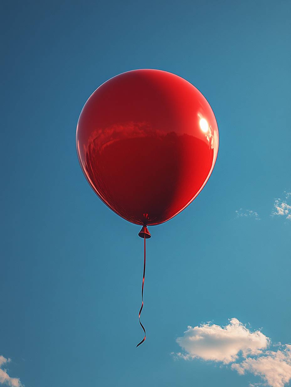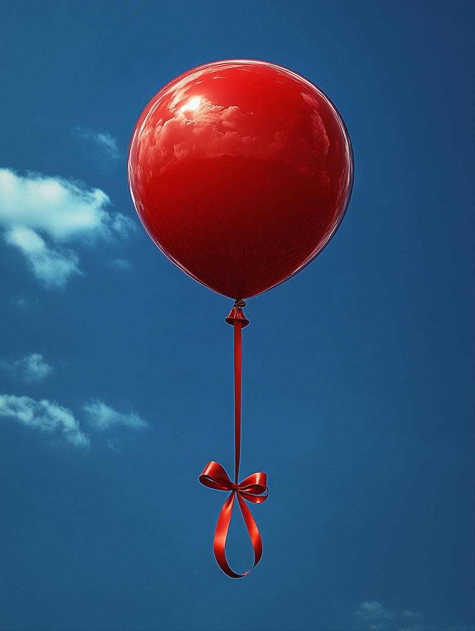 A red balloon, flowing ribbon, and blue sky behind it. The minimalist composition captures the essence of nature in this product photo, which was shot with a Canon EOS R5 camera and a standard lens. High resolution and fine details. --ar 3:4 --stylize 750 --v 6.1