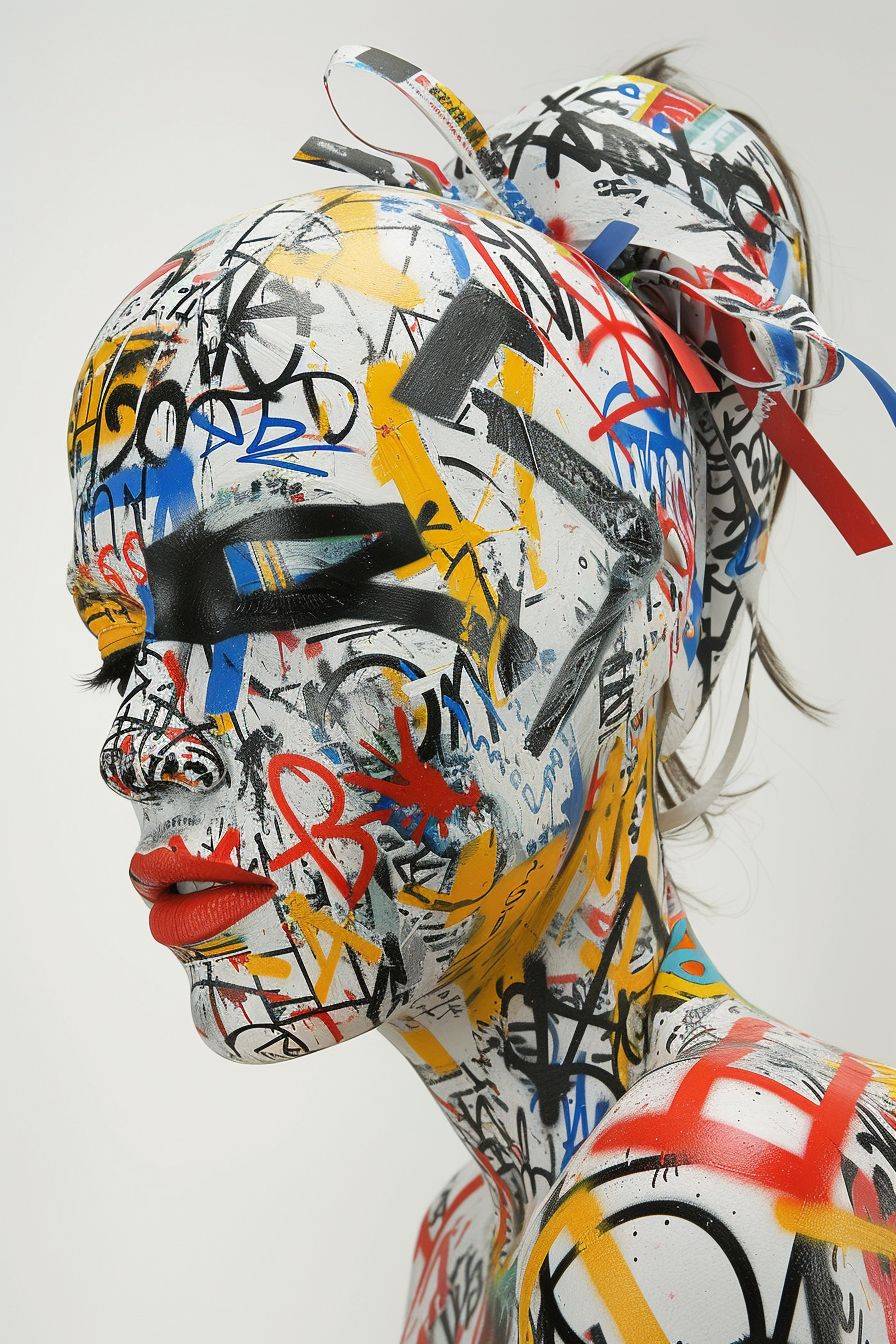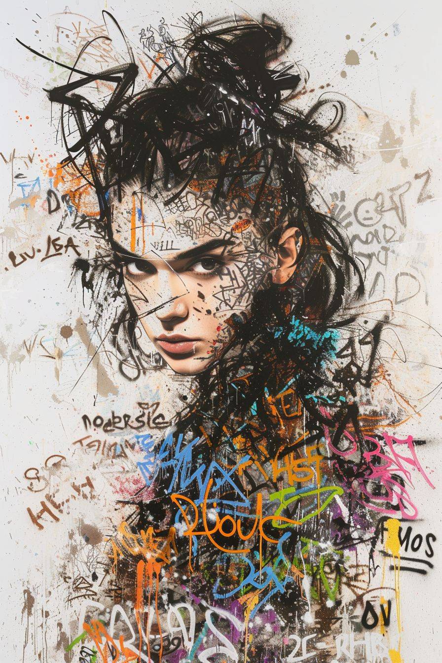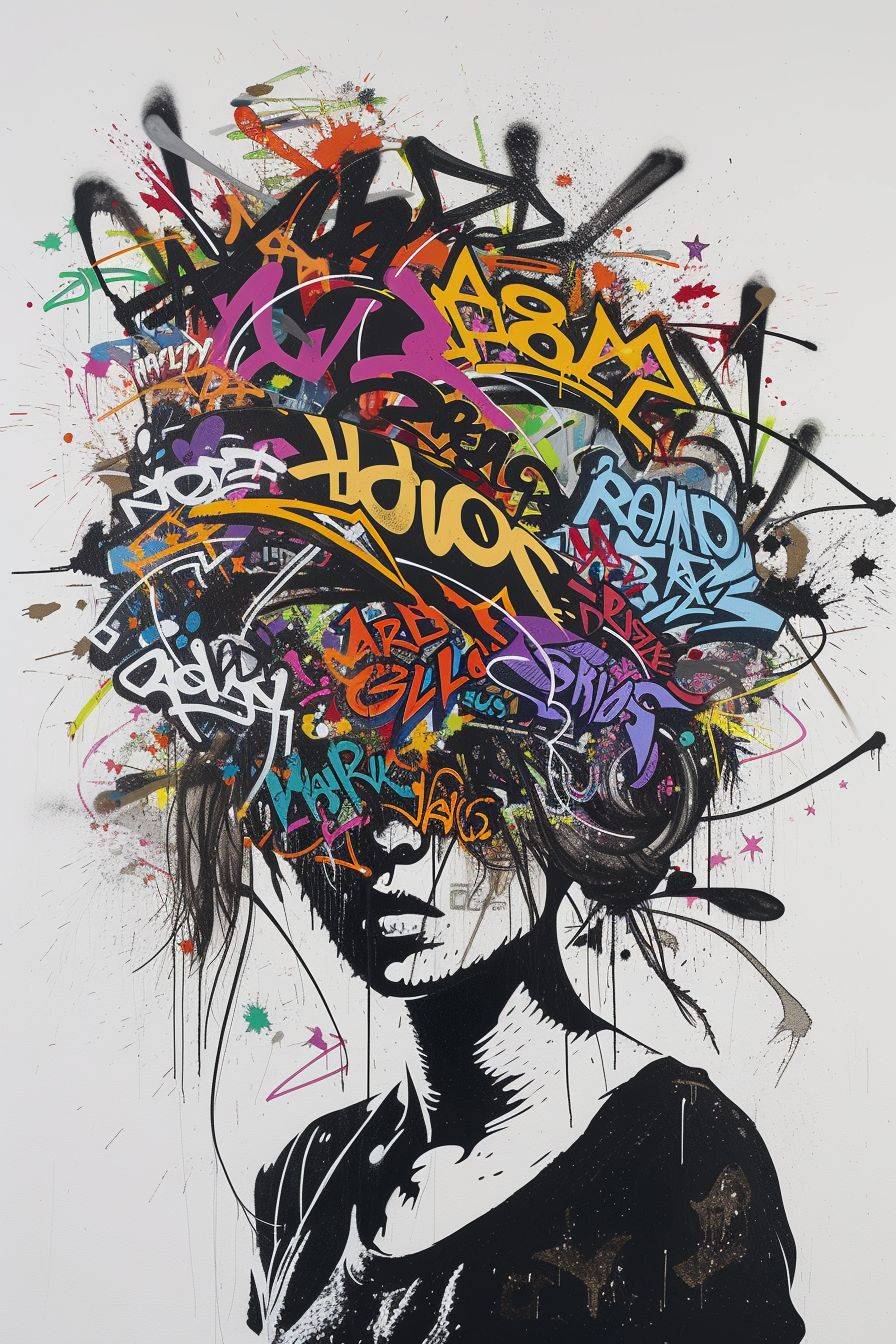 一个被野风格涂鸦装饰的吸引人的女性。复杂而动态的涂鸦字母覆盖了所有表面,特征包括大胆的标签、复杂的形状和鲜明对比的色彩。极简的白色背景增强了对被涂鸦覆盖的女性的关注,创造出一种视觉上动态且引人深思的构图。这个女性与野风格涂鸦的活力混乱之间的冲突象征着政治表达与当代城市文化在一个干净简约环境中的交汇。