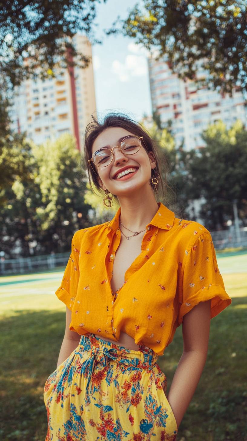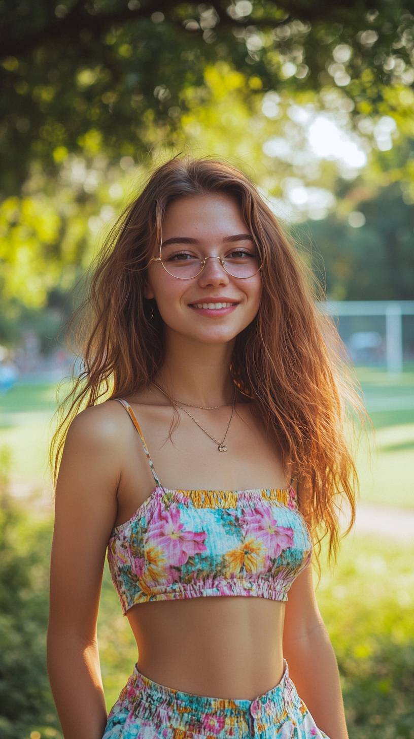 一位25岁的年轻活泼女孩,穿着鲜艳时尚的夏季服装,不戴眼镜,在白天的城市公园中享受生活并微笑,背景是一片体育场地。