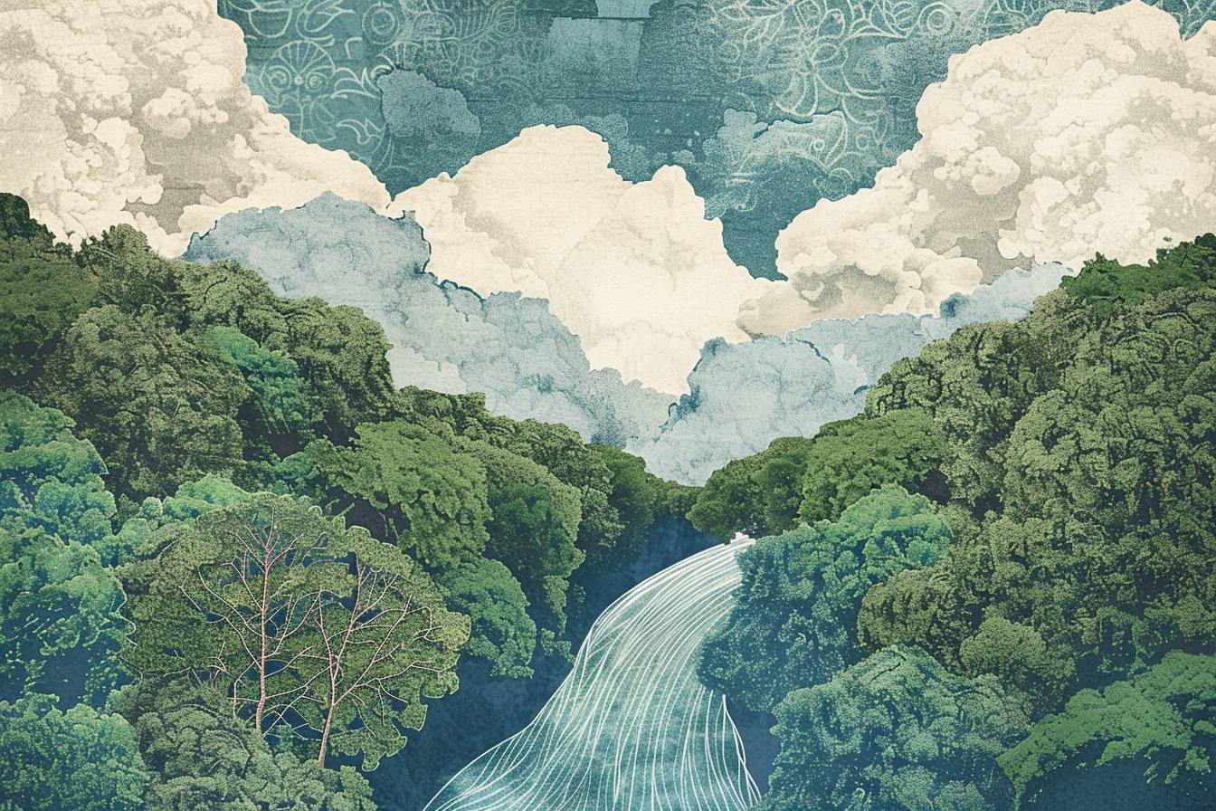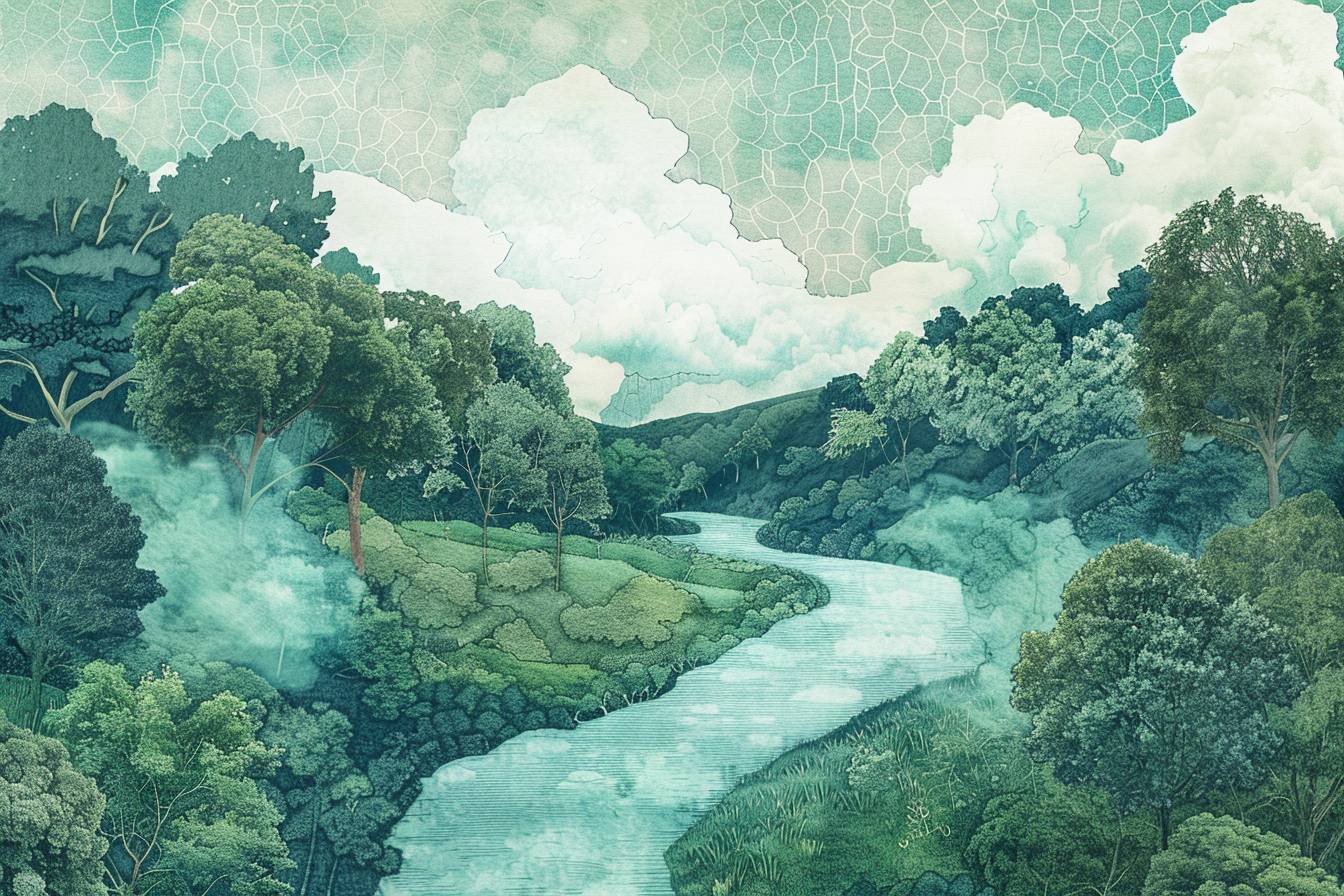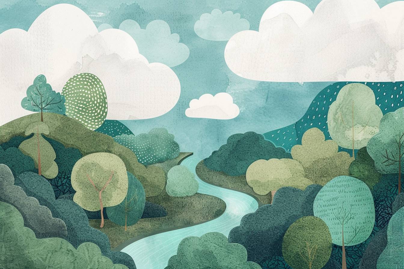 A blue river, green trees and white clouds, top view, patterned paper background, light sky blue and emerald green, soft colors, bright, whimsical children's book illustration --ar 3:2 --v 6.0 --p ziih212