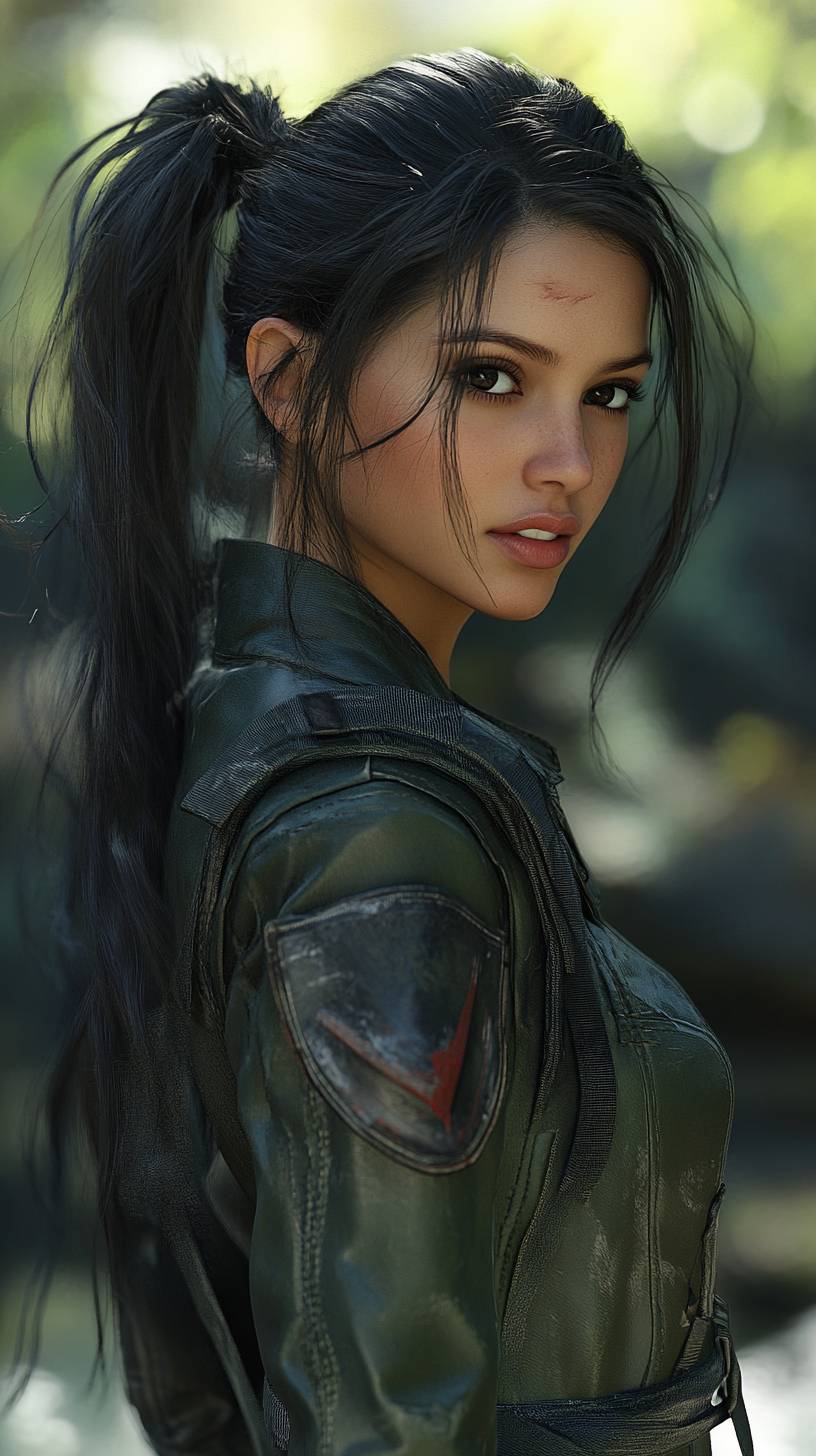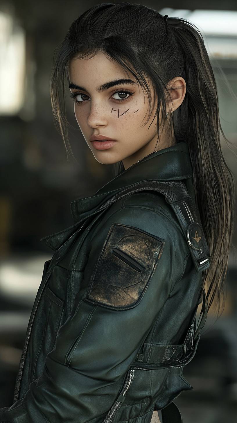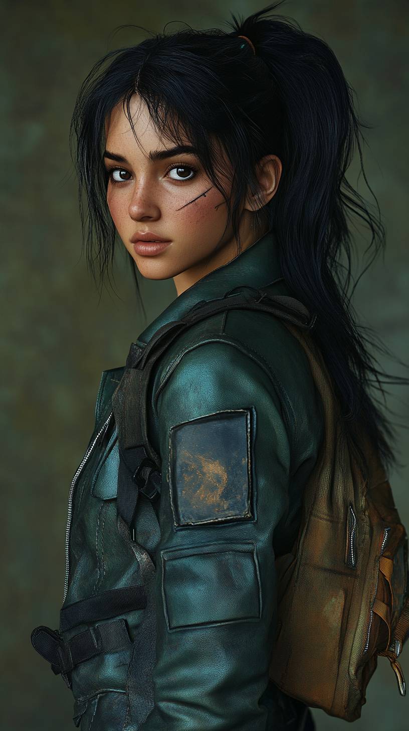 beautiful latina girl, wearing a dark green leather jacket, ponytail, arm patch, straps, rugged, post-apocalyptic, photo realistic, Hyper-Realistic, Hyper-Detailed, extreme details, 4k, --ar 9:16 --v 6.1
