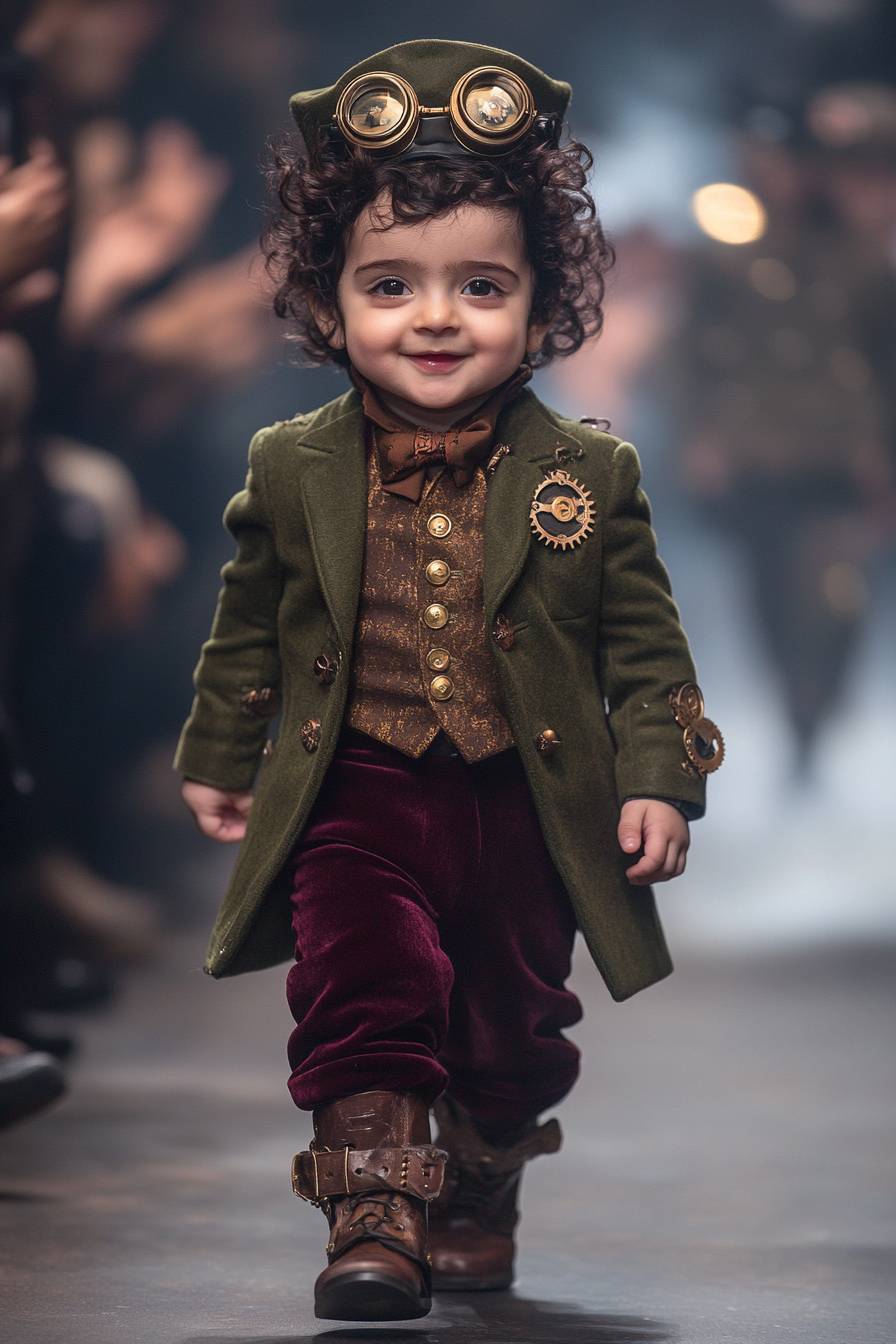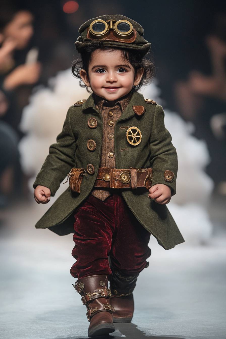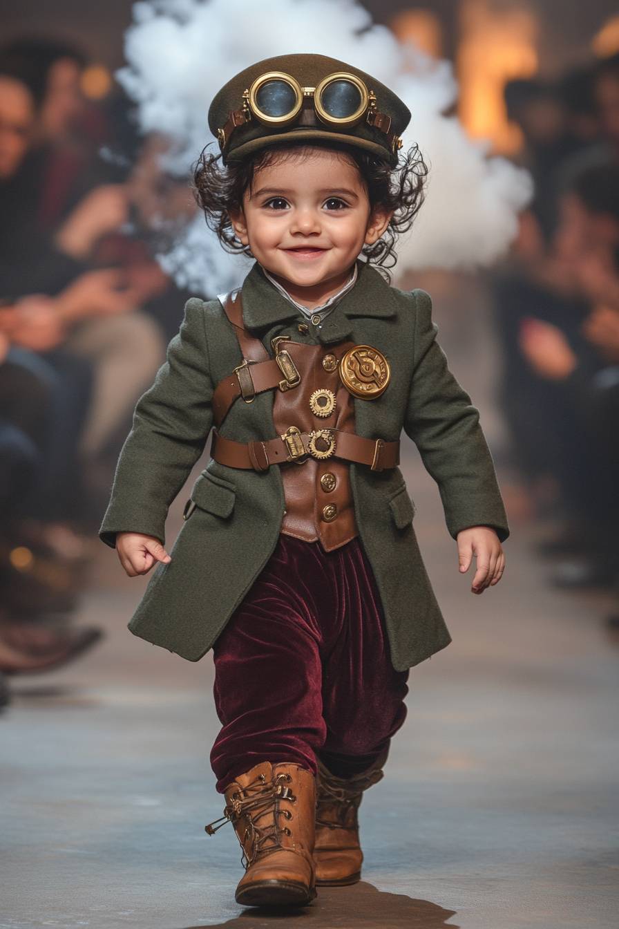 一张充满好奇的12个月大印度男婴的全身照,他有着大大的褐色眼睛和柔软的卷发,正高兴地在时装秀的跑道上走着。他穿着一件定制的橄榄绿色外套,配有金色的铜扣和齿轮作为装饰,腰间的皮革带和扣子紧束着。他的精致马甲上装饰着小型工作时钟齿轮,外面搭配一条深酒红色的天鹅绒裤子。他的迷你皮革系带靴子装饰有金属扣子,并以一顶带有铜护目镜和皮革带的小高帽作为全身造型的完美收尾。跑道场景设在一个蒸汽动力的火车平台上,下面冒出的蒸汽云营造出经典的蒸汽朋克氛围。观众们热烈鼓掌并拍照,男婴自信地朝镜头走来。使用索尼A7R IV拍摄,28mm镜头,温暖的色调。