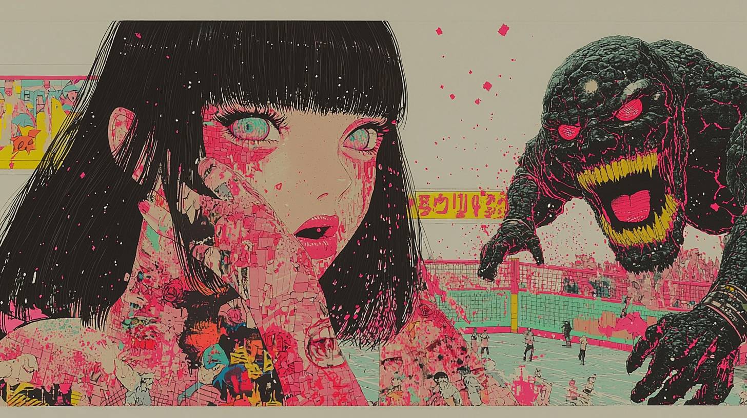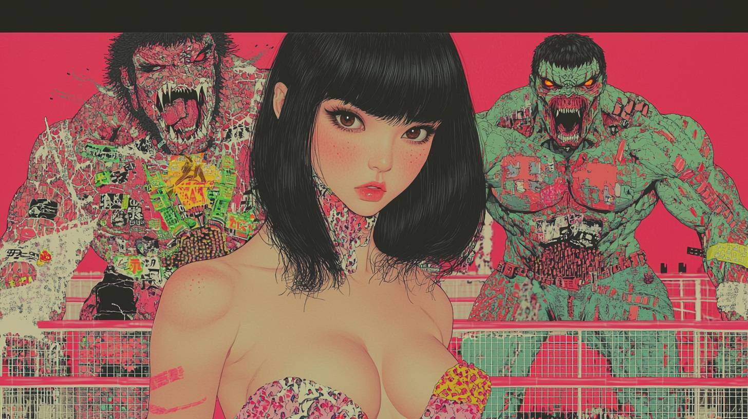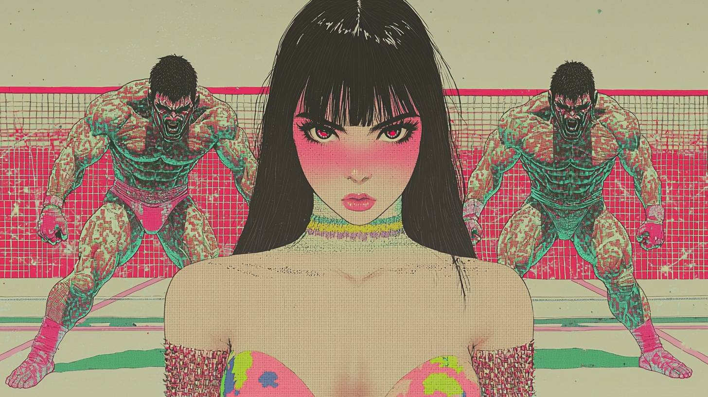 Ultra-wide shot, hyperdetailed 1990s retro cel-shaded anime, a beautiful woman covers in the foreground while two behemoth men battle for good in evil in a wrestling ring in the background, cinematic composition --ar 16:9 --quality 2 --sref 36205983 2178024008 --personalize f6v2ojr --sw 150 --stylize 500 --v 6.1