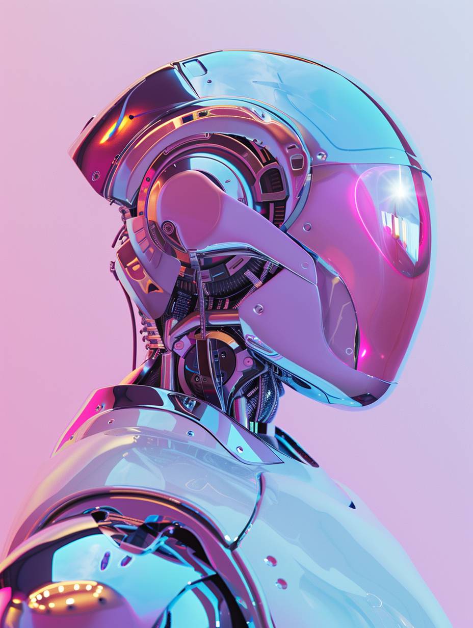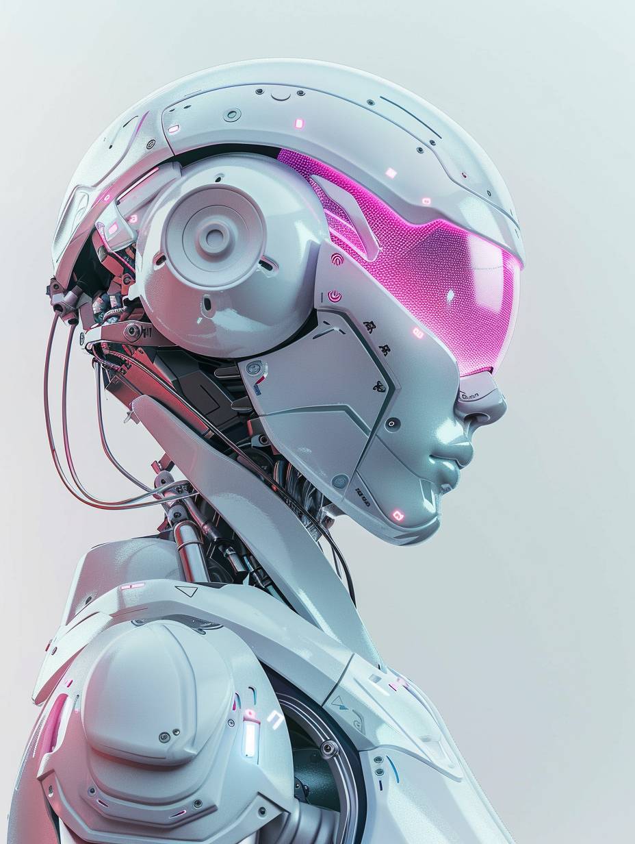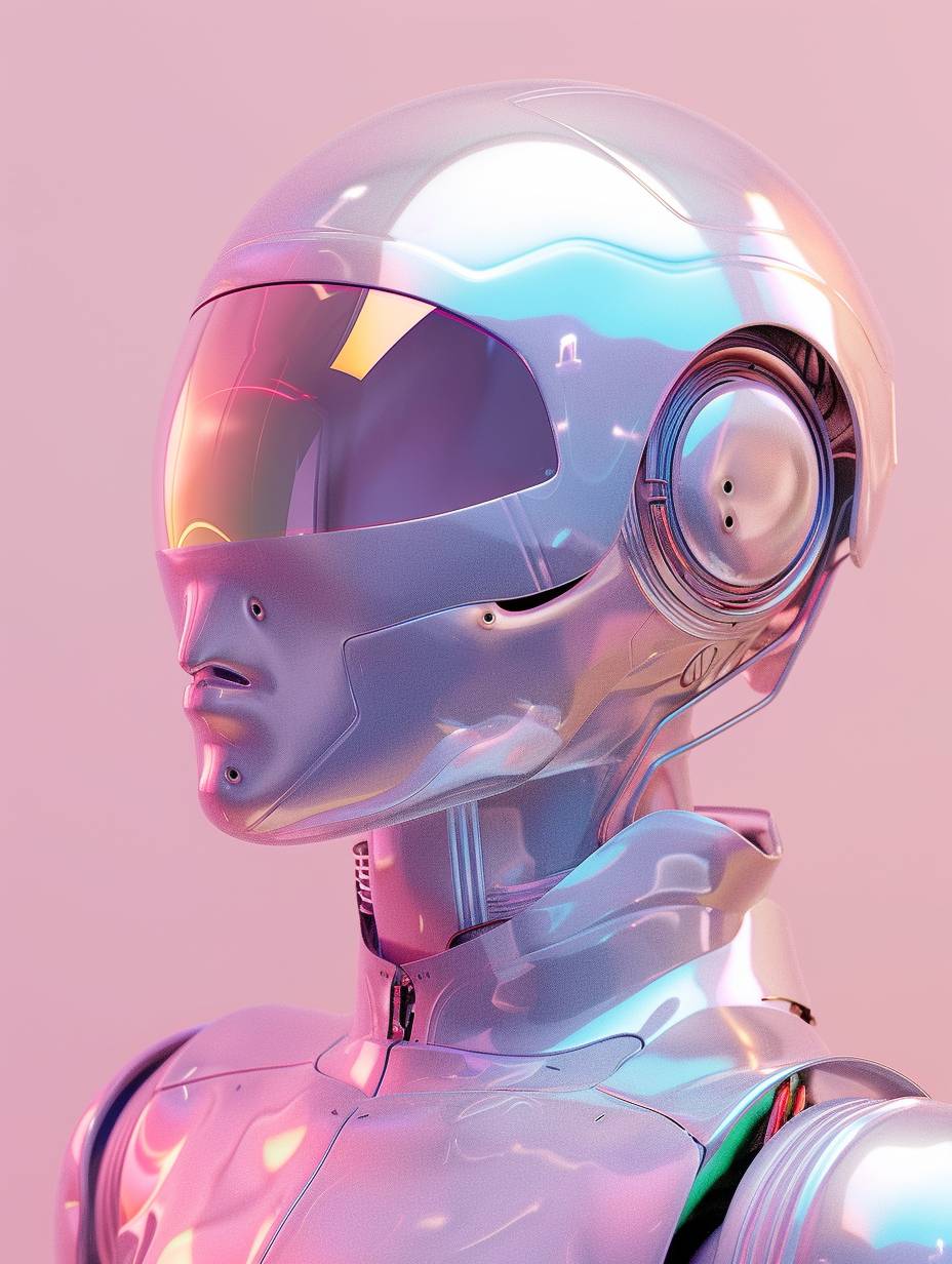 一个极简主义的未来主义AI机器人的肖像,珠光色的盔甲,柔和的背景色。