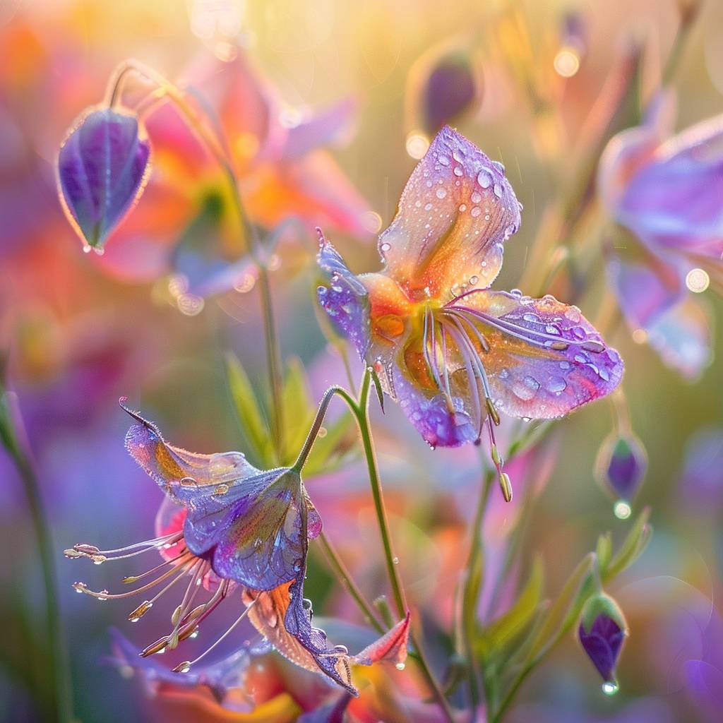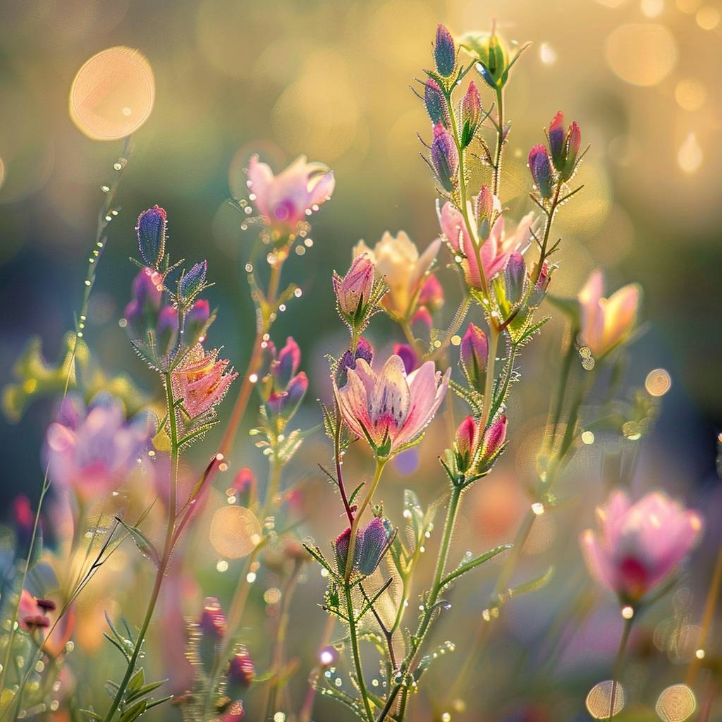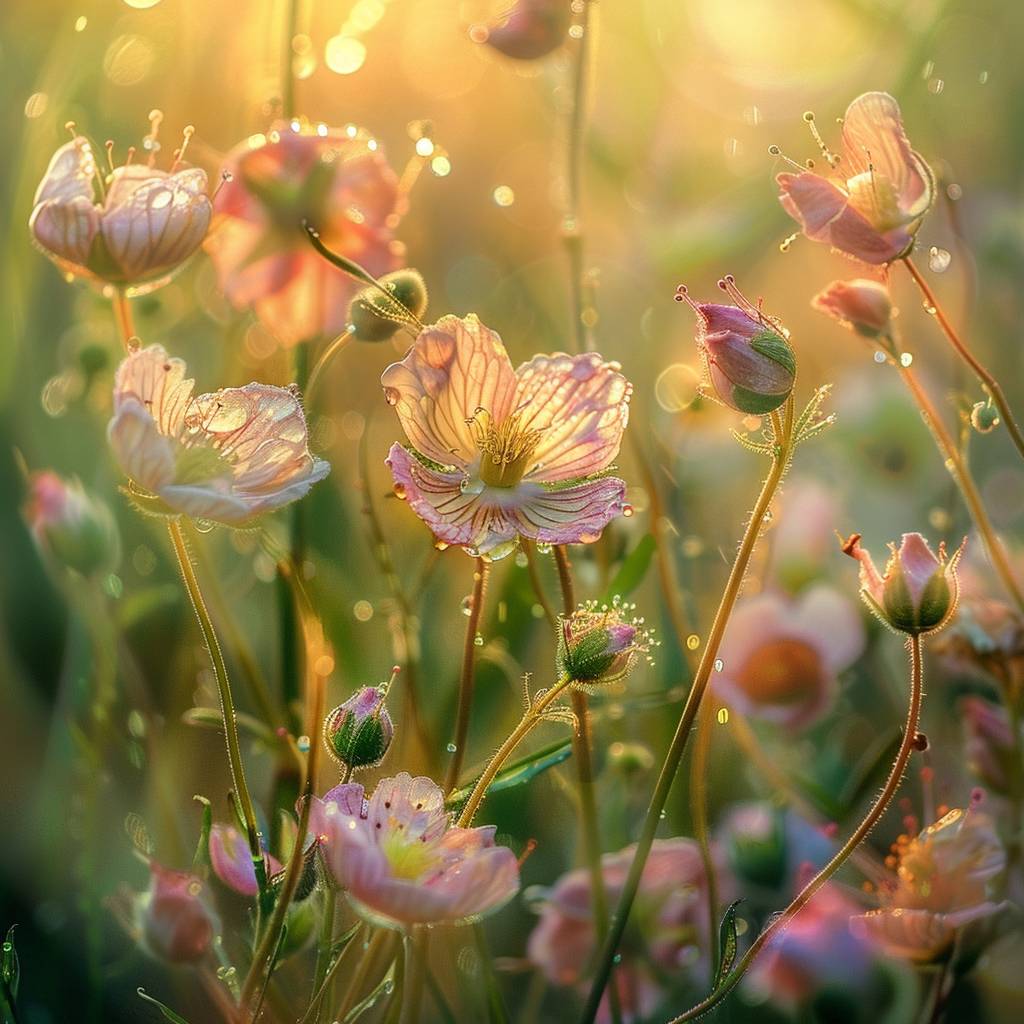 Enchanted meadow, flowers slowly unfurl under the first rays of the sun, revealing their vibrant colors and delicate petals. macro shot captures the intricate details of the awakening flowers, the soft morning light. Dew-kissed petals shimmer in the sunlight --v 6.0