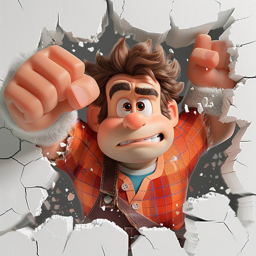 大力士拉尔夫从白色墙壁破拆而出,直视镜头,握紧拳头,表情搞笑,超逼真。