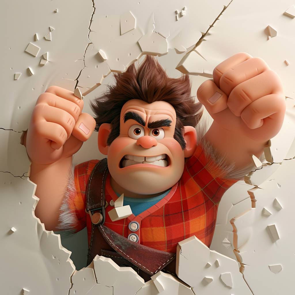 正面视角,特写镜头展示打破白色墙壁的破坏王拉尔夫,直视镜头,握紧拳头,面带搞笑表情,超现实主义风格
