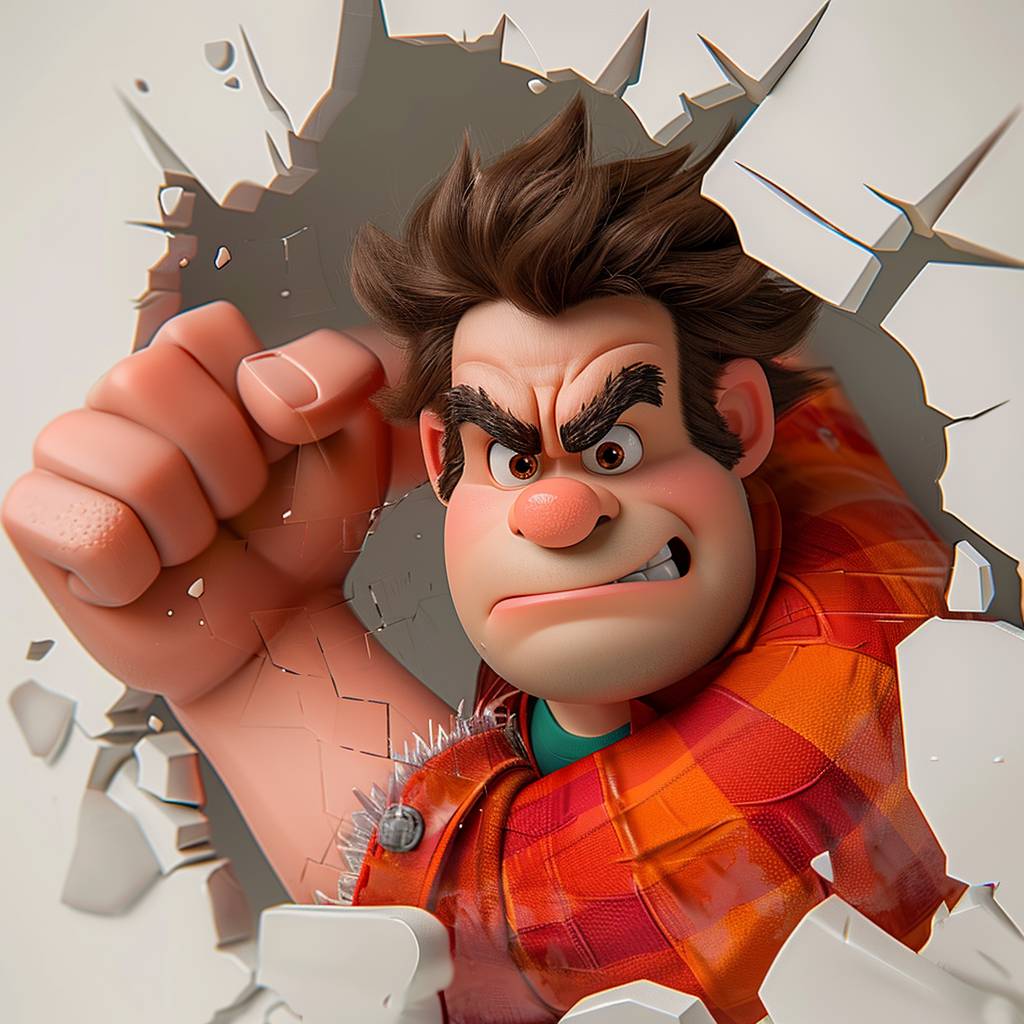 front view, closeup shot of wreck-it-Ralph breaking through the white wall, looking directly into the camera, with closed fist, funny face expression, hyper realistic --v 6.0