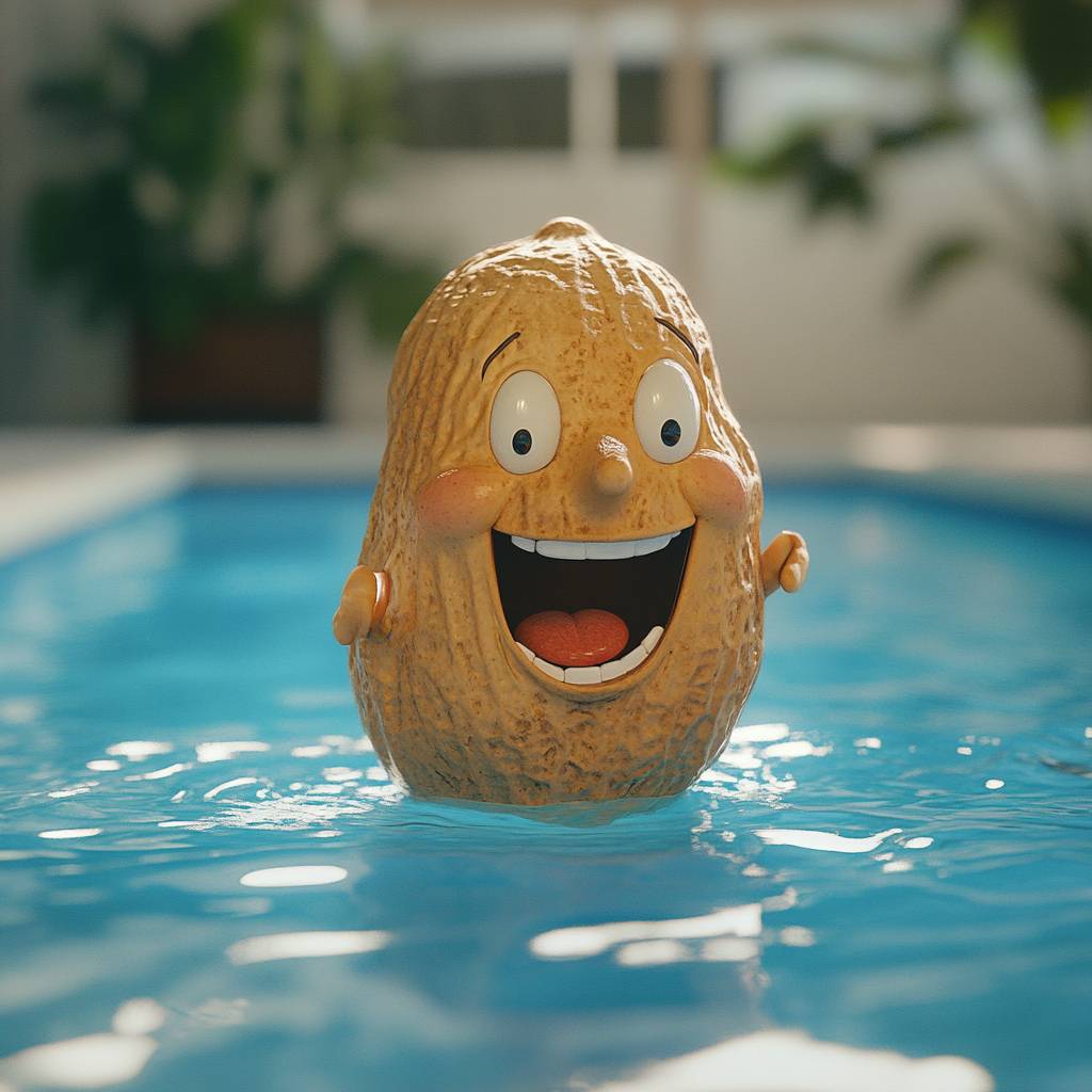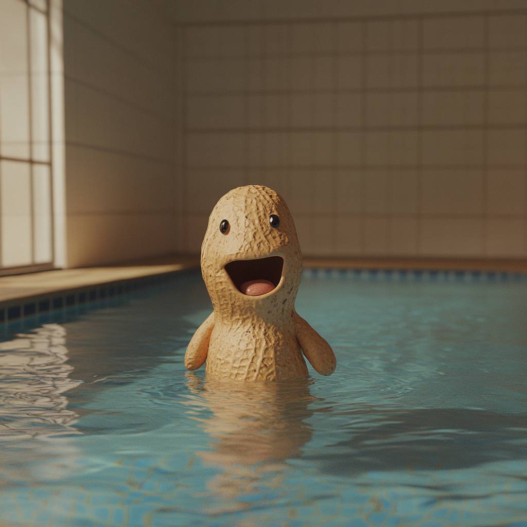 shooting of a peanut laughing behind a swimming pool, in wes anderson style --v 6.1