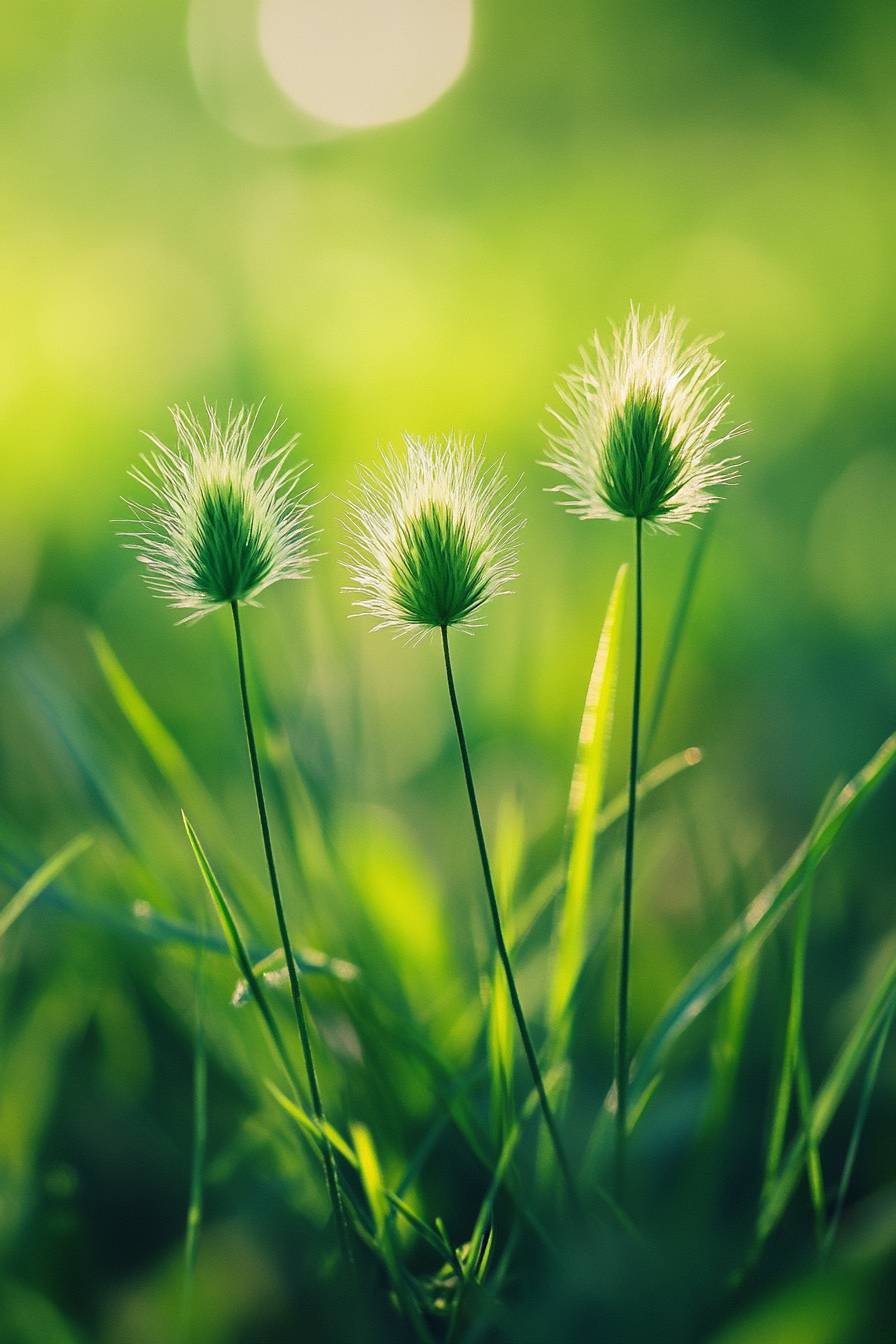 Three cute little green tufts with fluffy tops growing in the grass, macro photography, close-up, blurred background, sunlight exposure, green tone, bright and fresh natural light. The grass is lush and vibrant, with a simple composition that highlights their delicate textures and colors. --ar 2:3 --style raw --v 6.1
