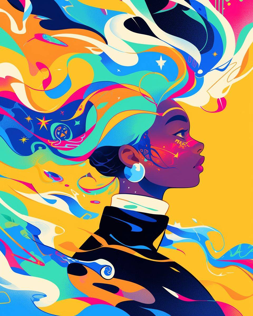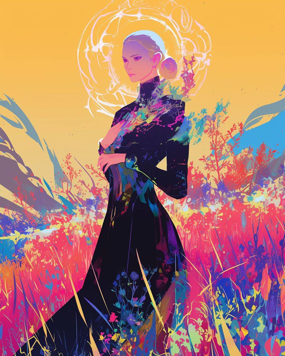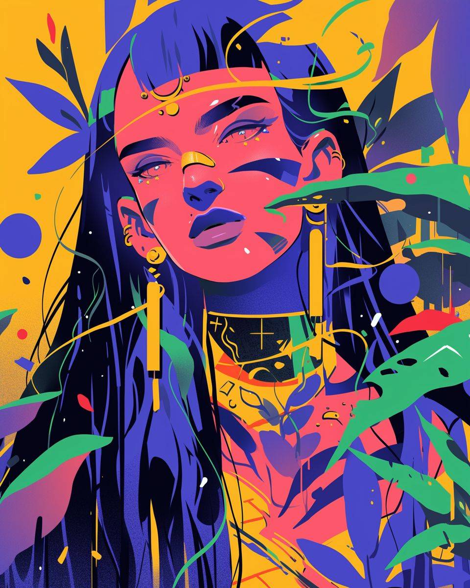 这是一个以亚原子朋克风格为主题的海报,描绘了一位美丽的彩虹自然精灵女性,色彩鲜艳且极简约。