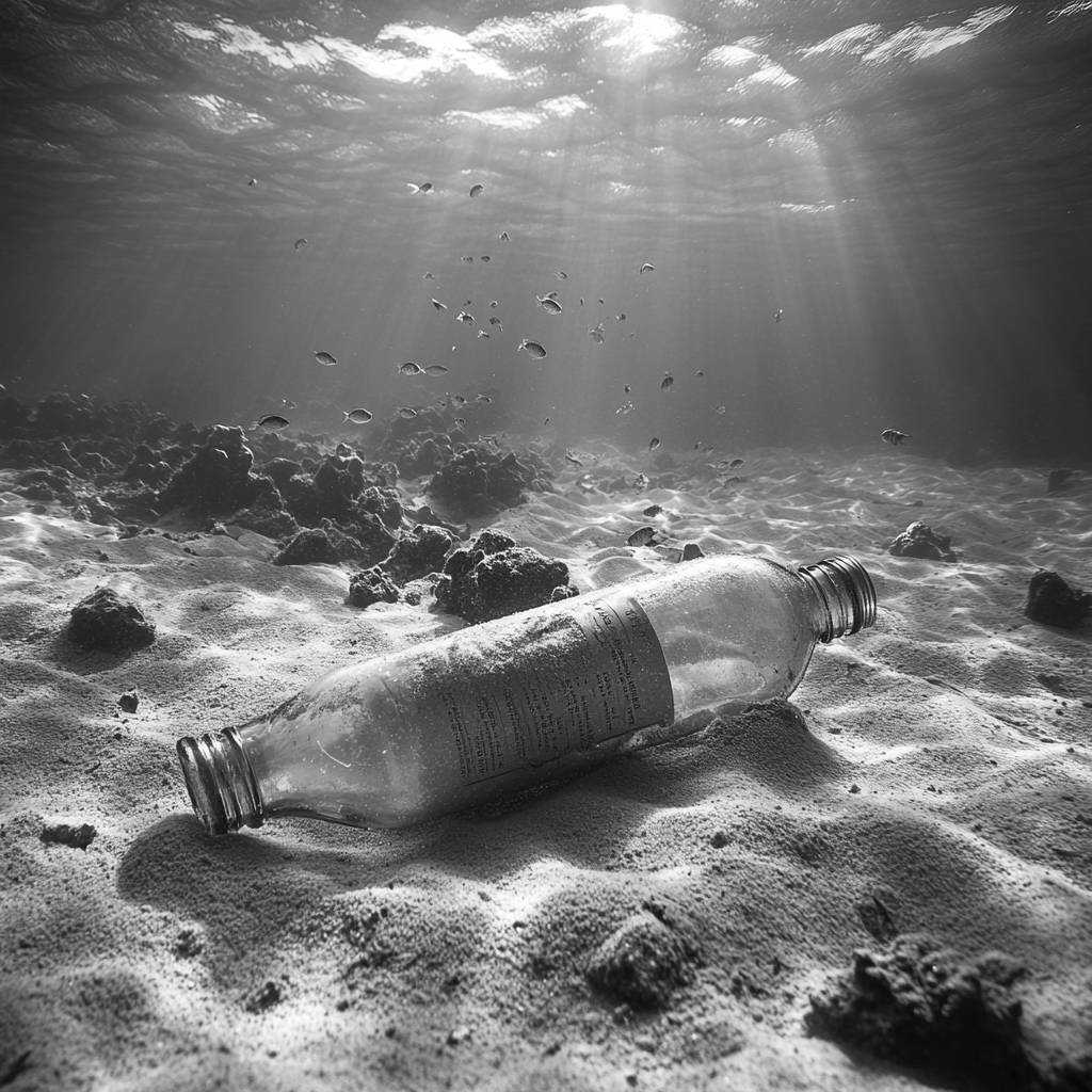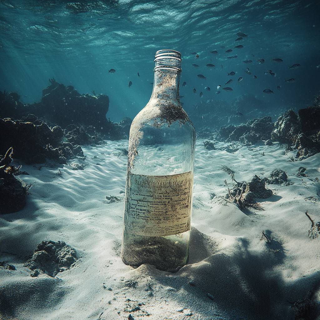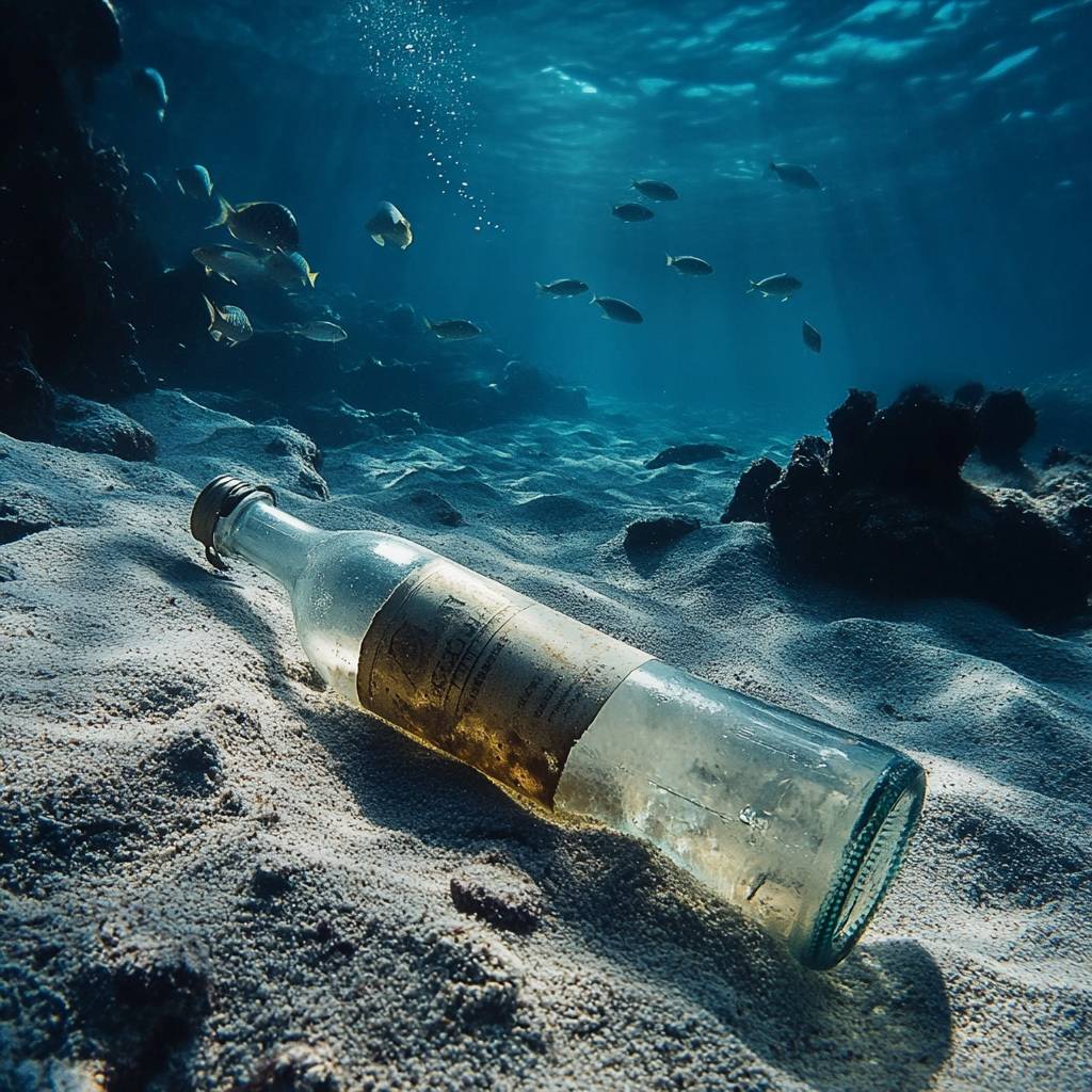一张水下照片,展示了一只带标签的玻璃瓶,瓶子部分被沙子覆盖,躺在海底,水很清澈,一群小鱼在瓶子周围游动,背景是广阔的海底,有岩石和沙子,光线柔和。