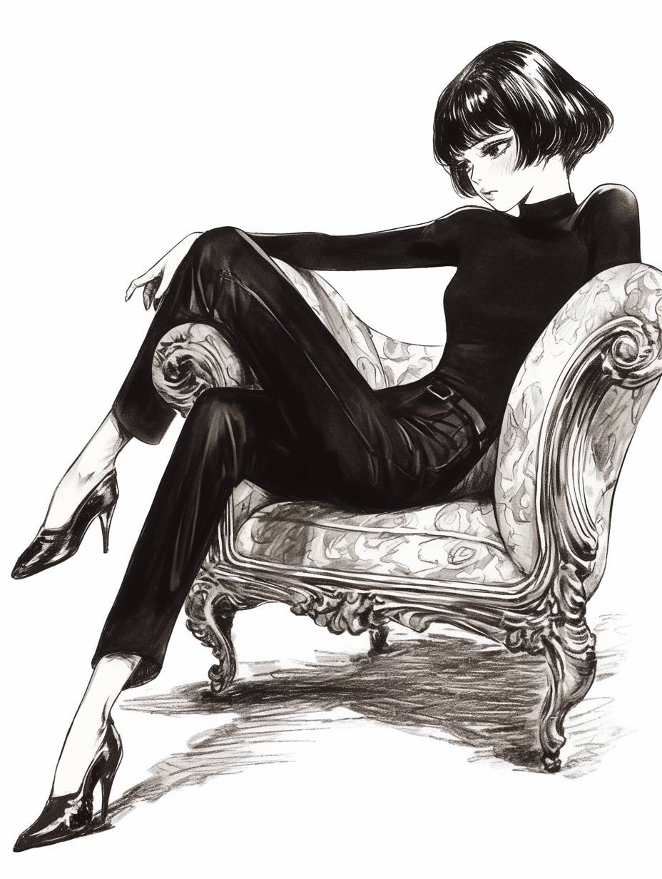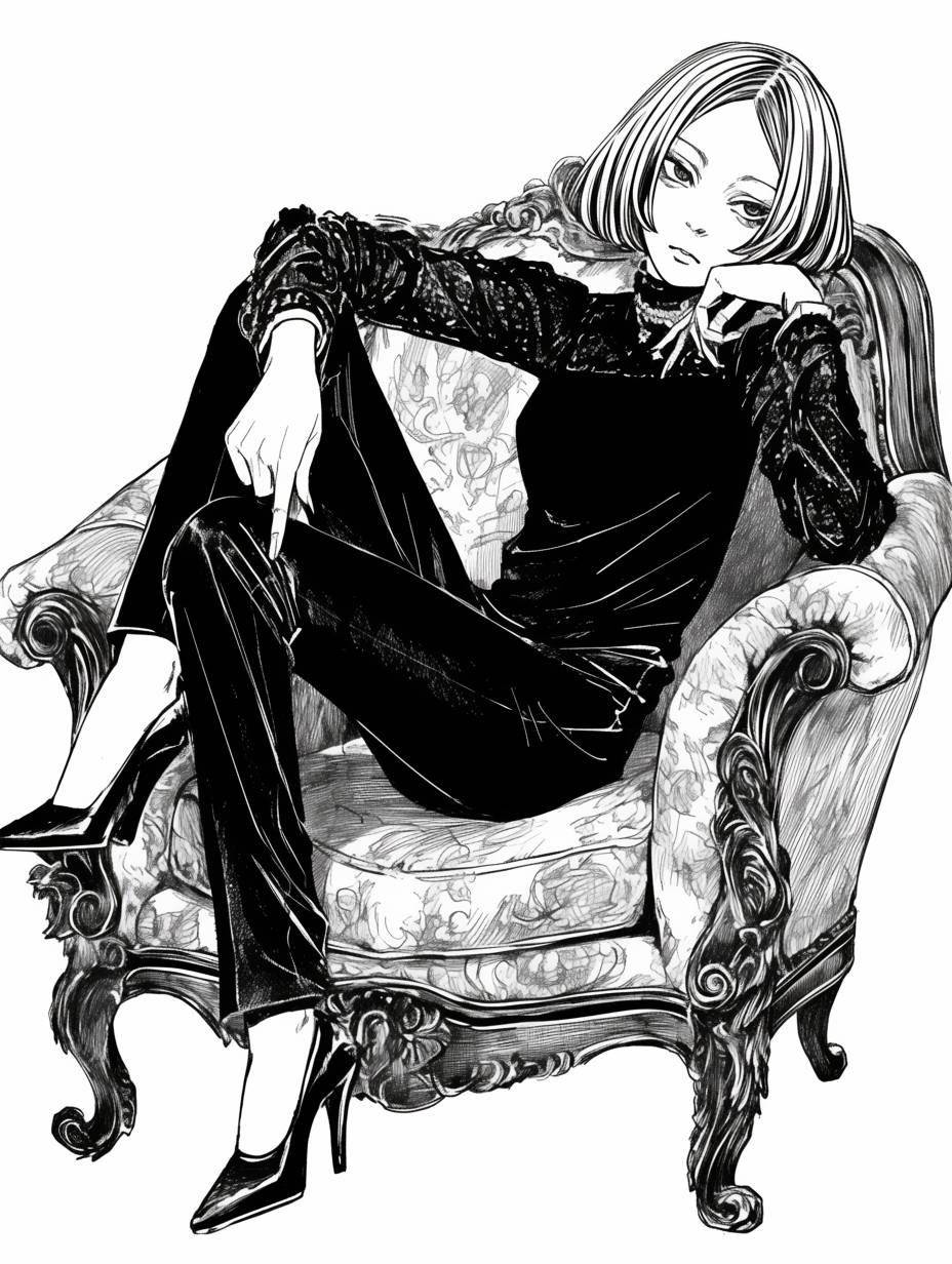 一幅漫画面板,描绘了一个短发女孩坐在优雅的沙发上,画风融合了伊藤润二和梅津泰弘的风格。这幅插图以黑墨水在白色背景上描绘,捕捉了她深思的表情,她一只手轻轻 resting 在扶手上。她的穿着包括宽松的裤子和时尚的鞋子,衬托出她苗条的身材。这一场景体现了艺术家独特的艺术风格,融合了黑暗奇幻和现实主义的细节。