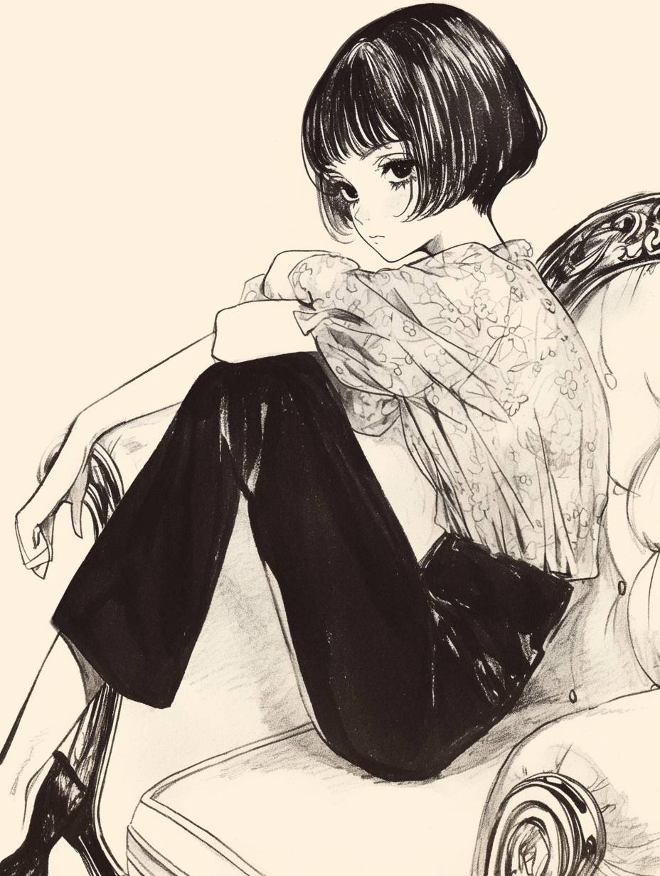 A manga panel featuring the girl with short hair sitting on an elegant sofa, drawn in the style of Junji Ito and Kazuo Umezu. The illustration is in black ink against a white background, capturing her contemplative expression as she sits with one hand resting gently on the armrest. Her attire includes loose-fitting trousers and fashionable shoes, complementing her slender figure. This scene embodies the artist's unique artistry, blending elements from dark fantasy and realist details. --ar 3:4 --stylize 50 --niji 6