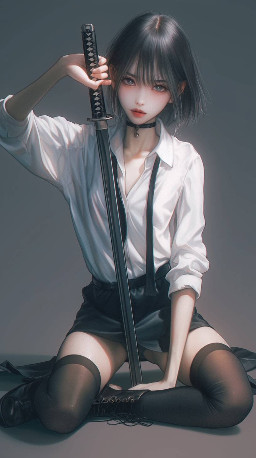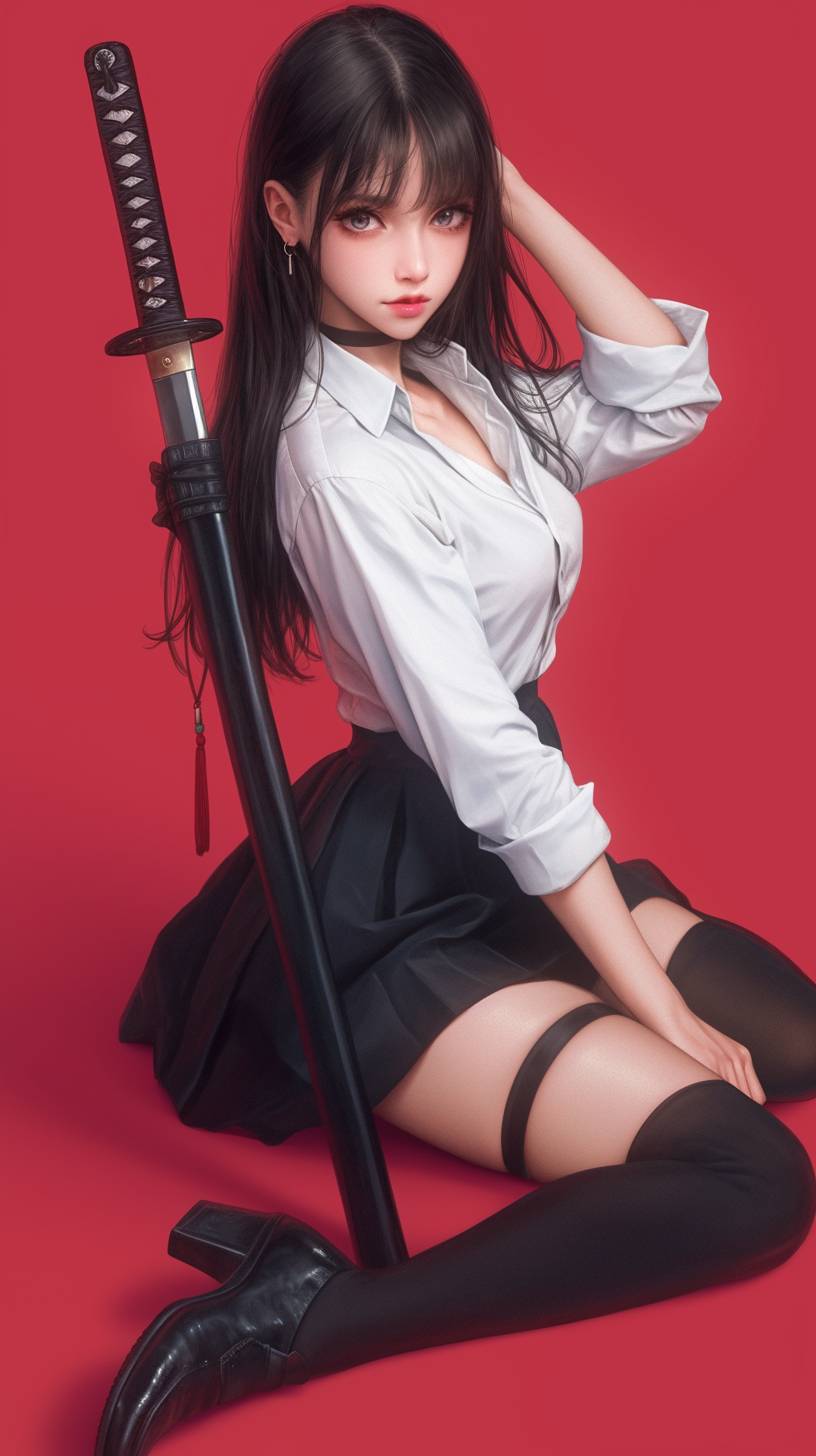 A photo of an Asian woman sitting on the ground, wearing a white shirt and black short skirt with long socks, holding a Japanese sword in one hand, a full-body shot, high-heeled boots, a cute face, in an anime style with realistic details, studio lighting, a solid color background, and a front view. --ar 9:16 --niji 6
