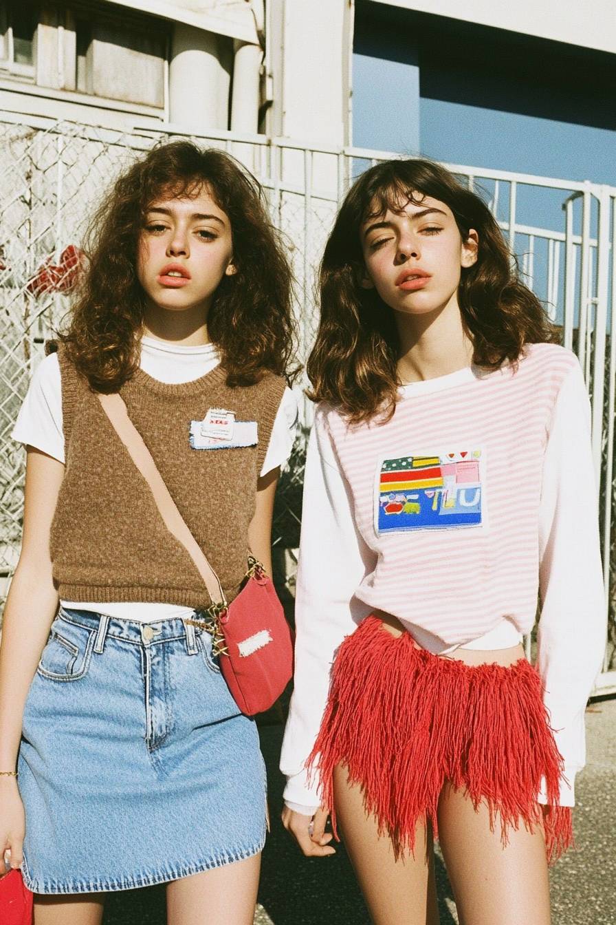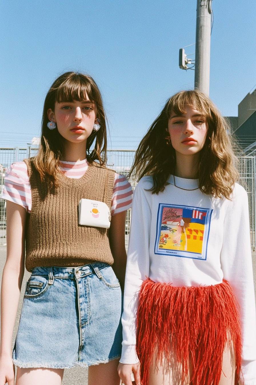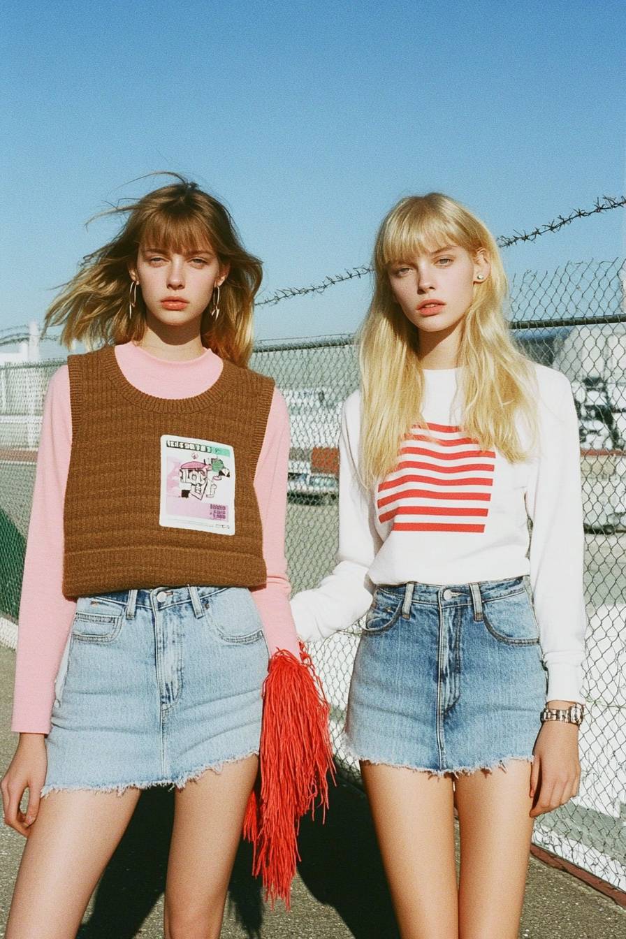 Two female models, both wearing A-line denim skirts with frayed edges. One is styled in a brown argyle sweater vest over a pink striped shirt, while the other wears a fitted white long-sleeve top with a graphic detail on the chest. They both complete their looks with oversized fuzzy socks and chunky shoes. The playful accessories, like a red fringed bag and hairpins, emphasize the retro yet fun aesthetic. --sref 4279850038 --personalize y61hewc --v 6.1 --ar 2:3