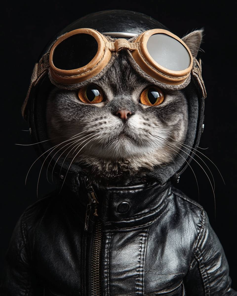 超真实的甜美风格肖像,一只穿皮衣的苏格兰折耳猫。