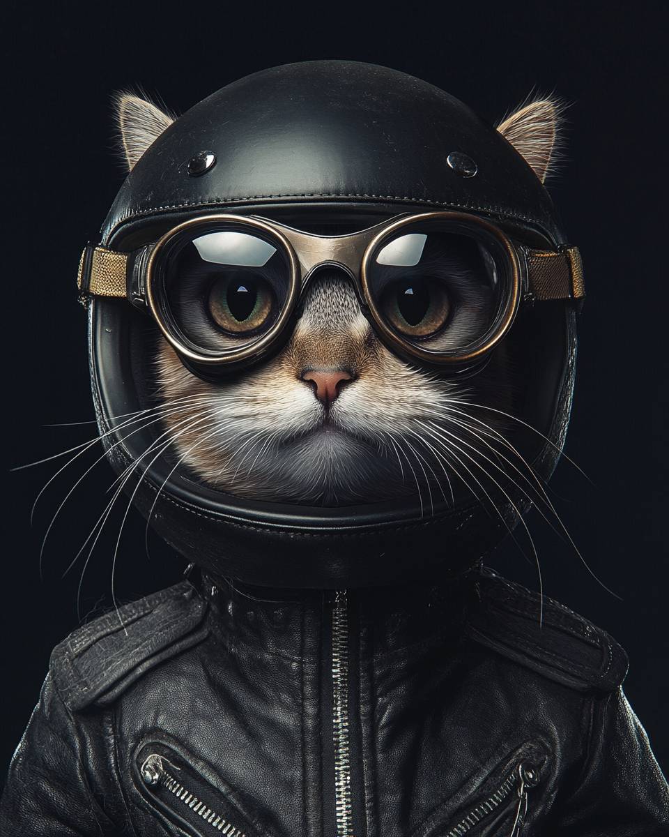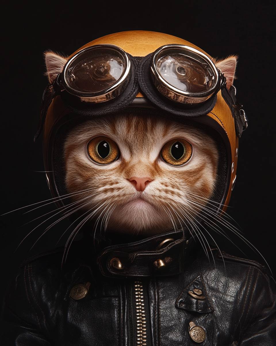 Hyperrealistic Yami Kawaii style portrait of biker gang Scottish Fold cat wearing leathers, goggles on helmet, ultra-detailed, looking to camera, studio lighting, black background, portrait, cinematic lighting. --ar 4:5 --style raw