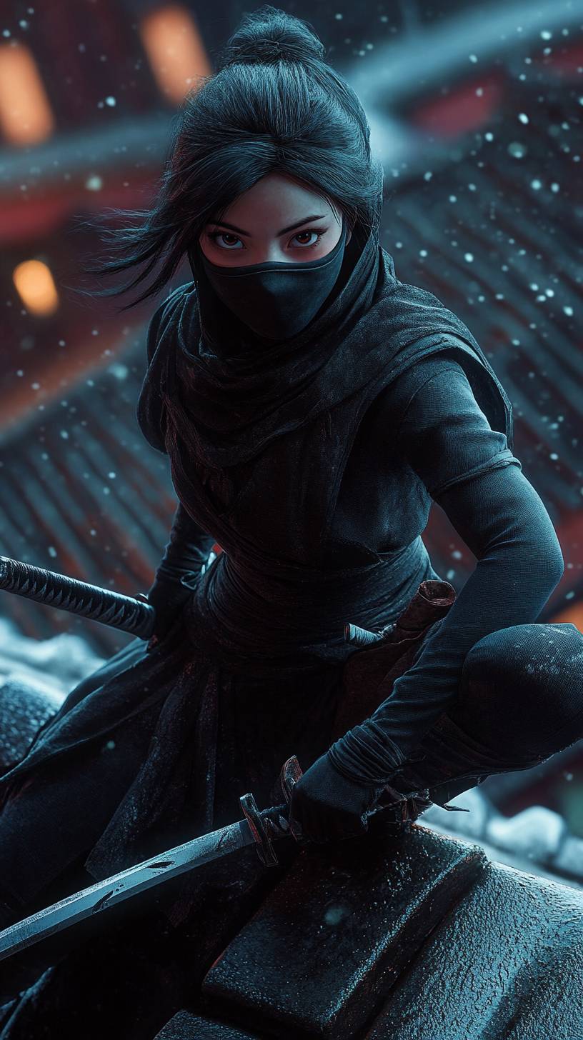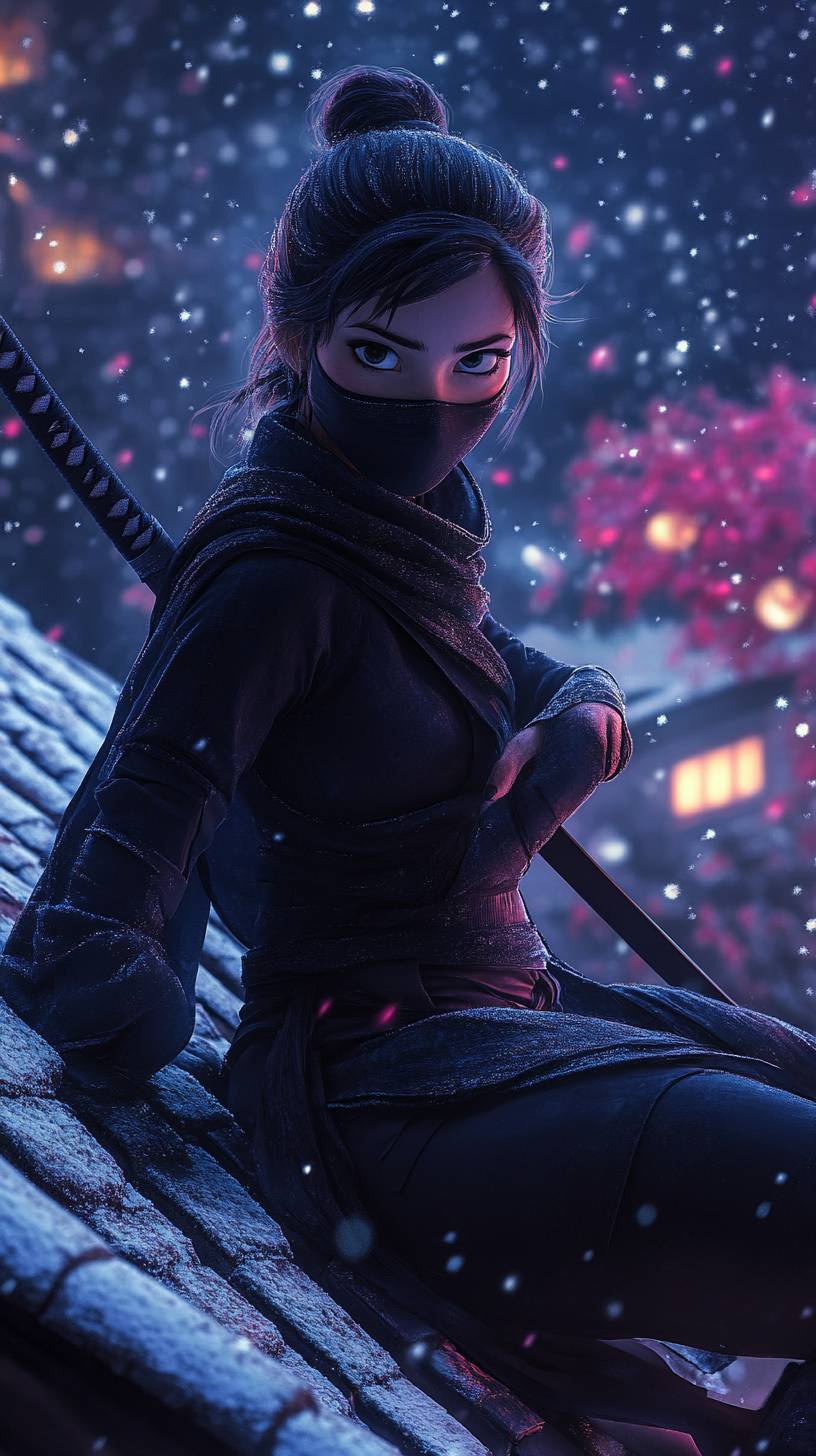 冰雪奇缘中的安娜,身穿黑色忍者服,戴着面具,手持武士刀,站在屋顶上,夜间全身肖像,4K