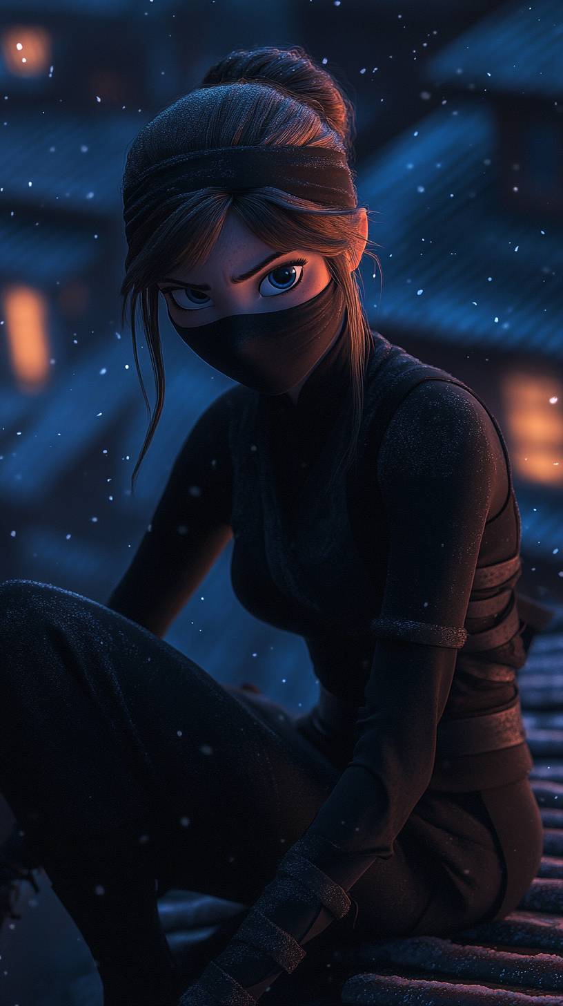 Anna from Frozen, dressed as a ninja in black, face mask, holding a kitana, on a roof, at night, full body portrait, 4K --ar 9:16 --v 6.1