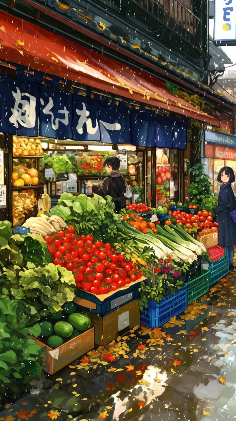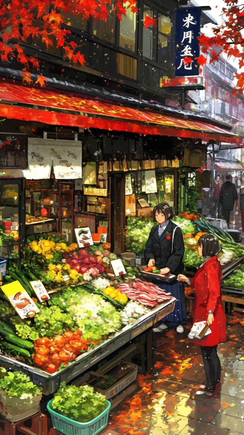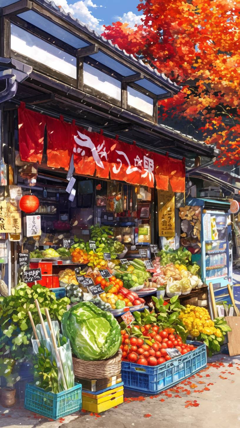 Highest quality, Showa era, streets, vegetable shop, fish shop, shopping district, nostalgic, autumn, nostalgic feelings. --ar 9:16 --personalize 9ujulo8 --stylize 600 --niji 6