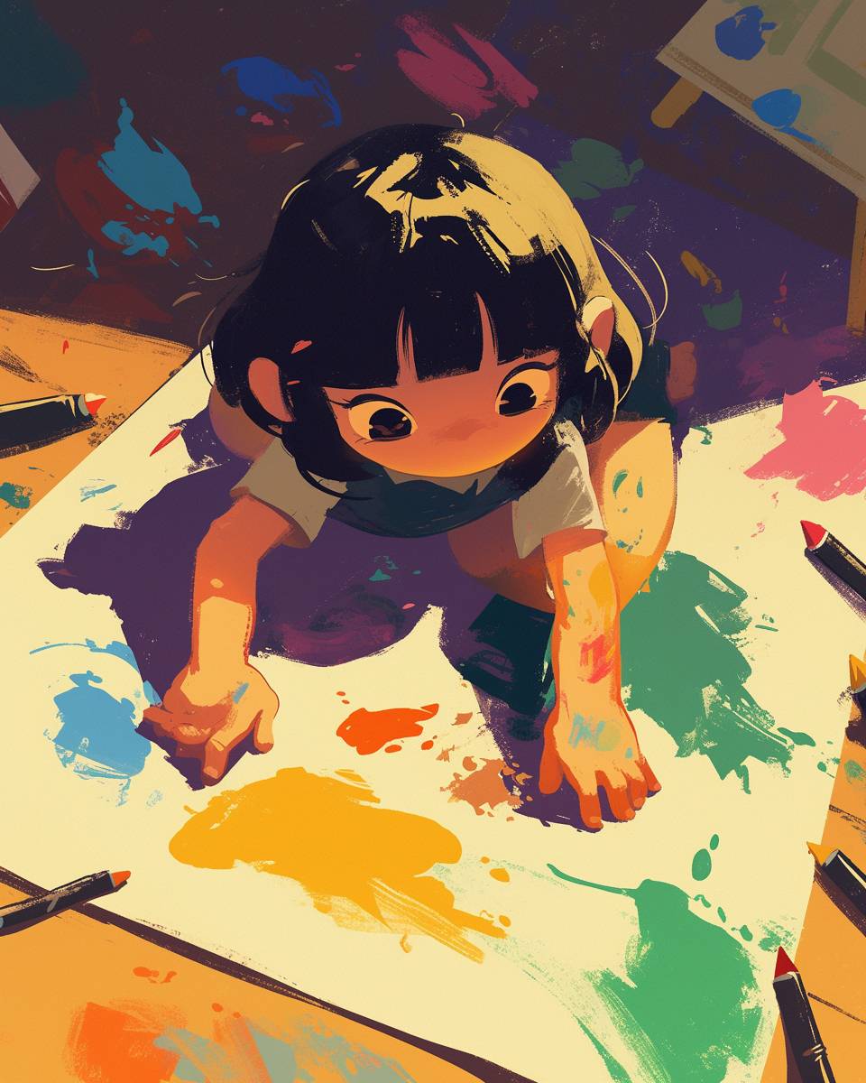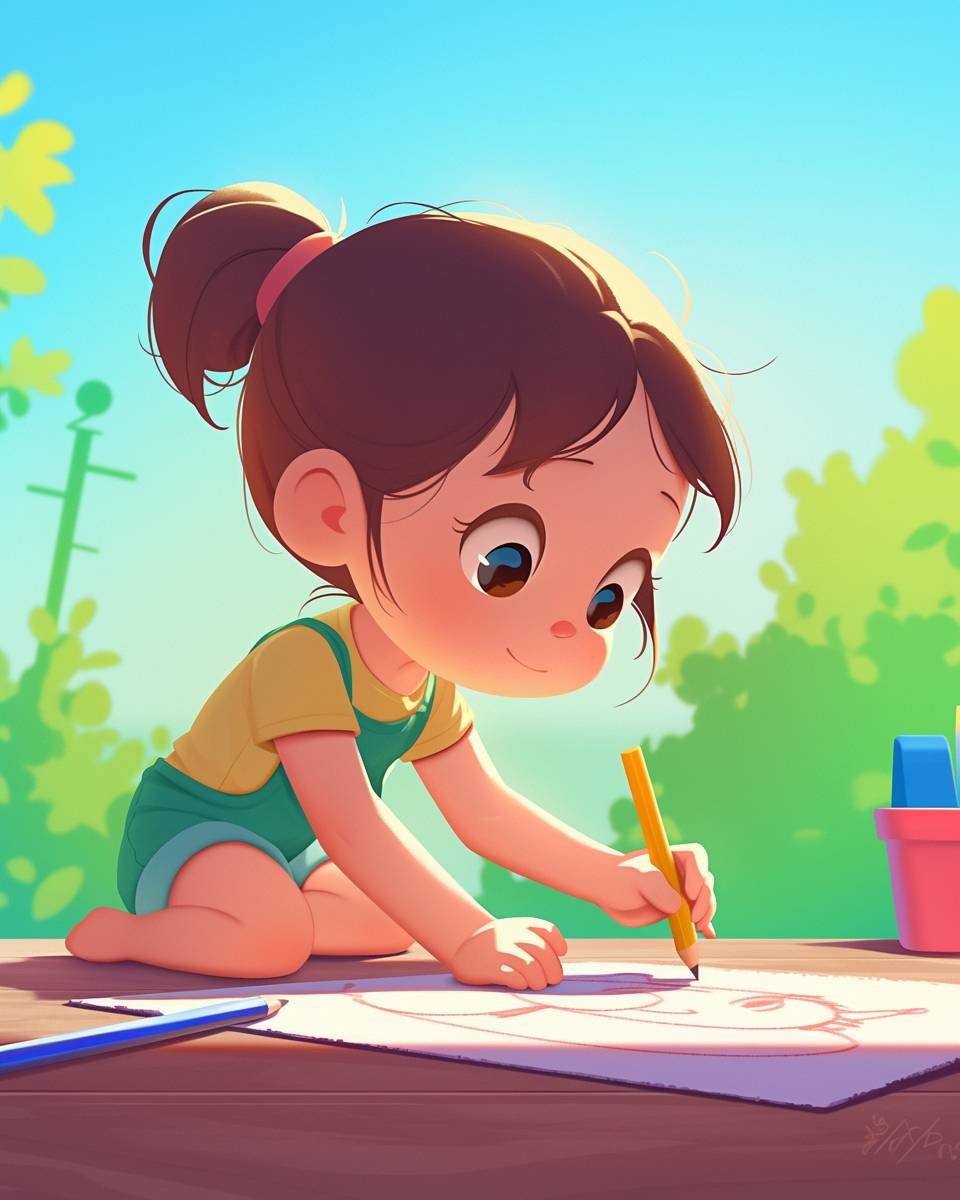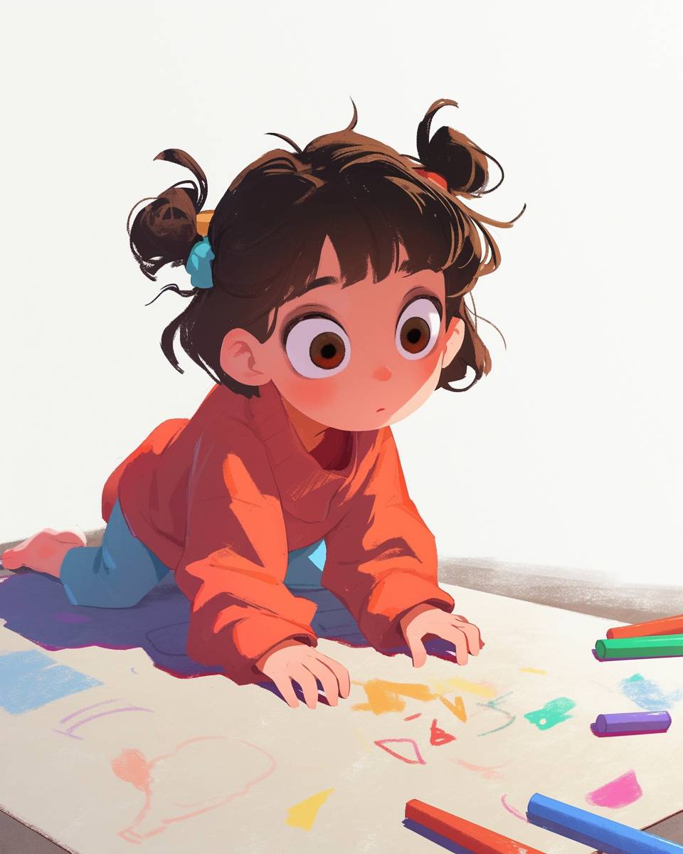Cartoon. A kid is coloring her picture with crayons on the ground --ar 4:5 --niji 6